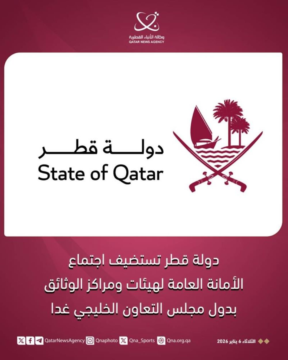 الثلاثاء 6 يناير 2026 05:28 صباحاً الدوحة - /قنا/ تستضيف دولة قطر اجتماع الأمانة العامة لهيئات ومراكز الوثائق بدول مجلس التعاون الخليجي في دورته الثامنة والثلاثين، وذلك يوم غد الأربعاء.