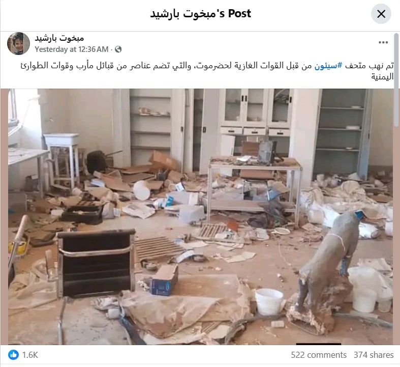 حصدت الصورة آلاف المشاركات والتفاعلات، مصحوبة بوصف مُضلل يزعم أنها لمتحف سيئون بعد تعرضه للنهب.