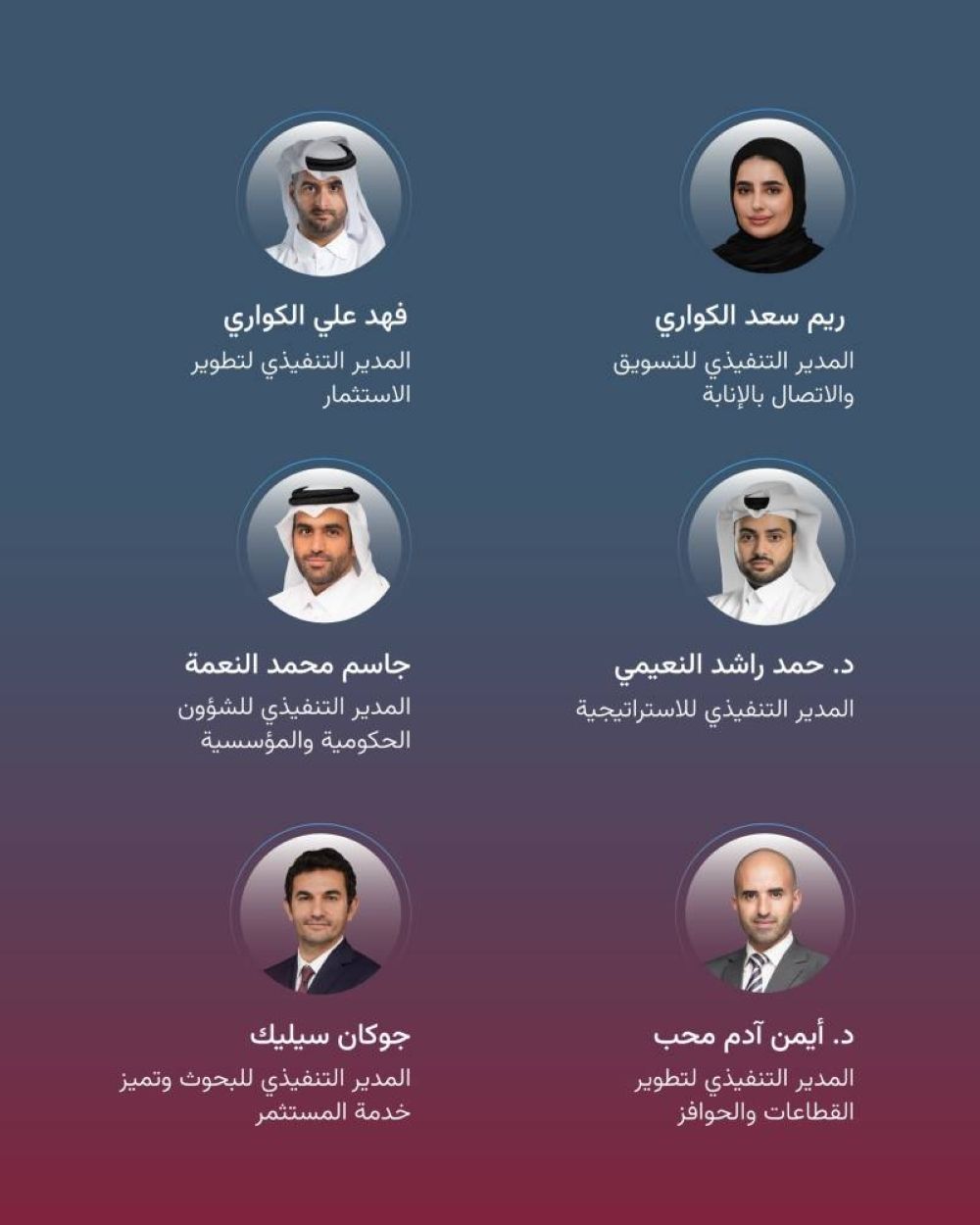 وشمل الهيكل الإداري الجديد تعيين كل من: فهد علي الكواري مديرًا تنفيذيًا لتطوير الاستثمار، وريم سعد الكواري مديرًا تنفيذيًا للتسويق والاتصال بالإنابة، وجاسم محمد النعمة مديرًا تنفيذيًا للشؤون الحكومية والمؤسسية، والدكتور حمد راشد النعيمي مديرًا تنفيذيًا للاستراتيجية، وجوكان سيليك مديرًا تنفيذيًا للبحوث وتميّز خدمة المستثمر، والدكتور أيمن آدم محب مديرًا تنفيذيًا لتطوير القطاعات والحوافز.
