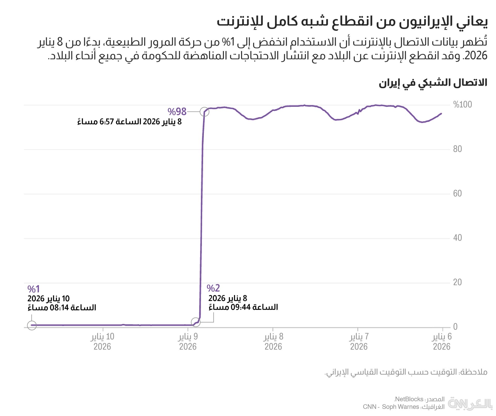 ووفقًا لهيئة رقابية، فإن انقطاع الإنترنت الذي فرضه المسؤولون لا يزال مستمرًا، لكن أحد سكان طهران قال لشبكة CNN إنه فشل في قمع الاحتجاجات.