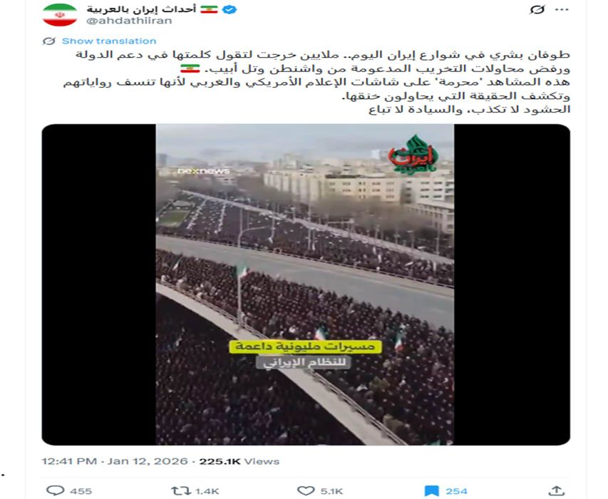 ورافقه وصف يقول: "طوفان بشري في شوارع إيران اليوم.. ملايين خرجت لتقول كلمتها في دعم الدولة ورفض محاولات التخريب المدعومة من واشنطن وتل أبيب. هذه المشاهد "محرمة" على شاشات الإعلام الأمريكي والغربي لأنها تنسف رواياتهم وتكشف الحقيقة التي يحاولون خنقها. الحشود لا تكذب، والسيادة لا تباع".