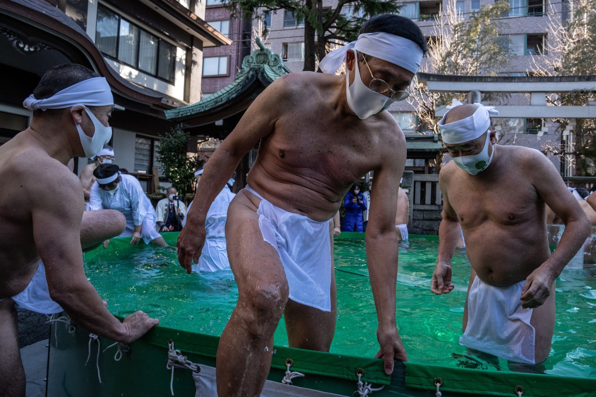 وجذب حدث التحمّل البارد، المعروف باسم "كانشو ميسوجي"، نحو 100 مشارك، غالبيتهم من الرجال يرتدون الأغطية القطنية البيضاء، وعدد من النساء بأردية بيضاء.
