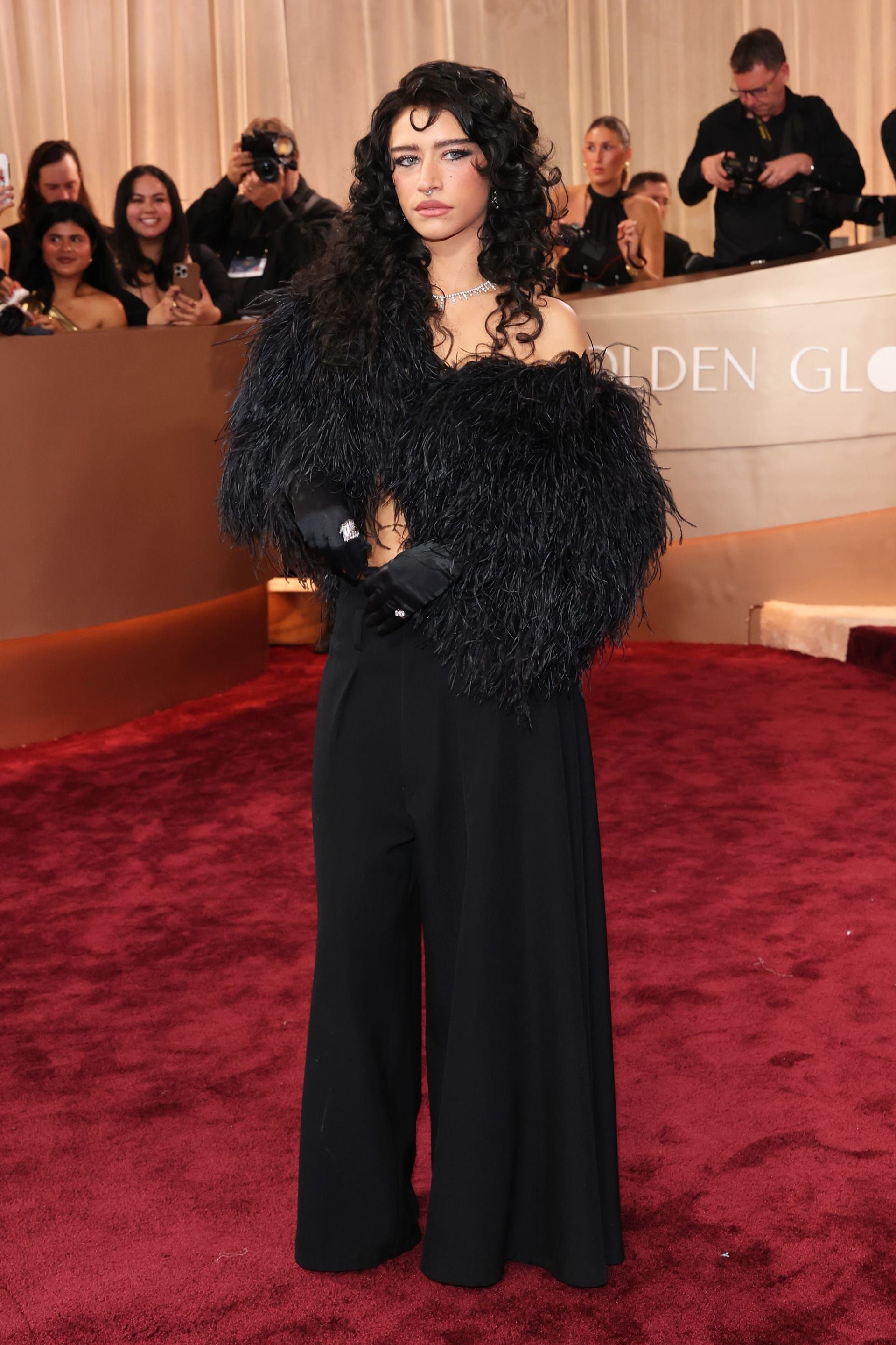 كذلك حال الممثّلة الأمريكيّة جينا أورتيغا، التي اعتادت على تقديم إطلالات قاتمة وحادّة على السجادة الحمراء، واختارت في الحفل فستانًا أسود اللون من الساتان بياقة عالية على طراز الملكة فيكتوريا وأكمام منفوخة مزينة بخيوط طويلة تشبه الأكتاف من المصممة البريطانية-التركية ديلارا فينديكوغلو.