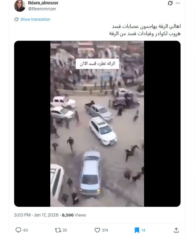 وتتوافر نسخة من الفيديو عبر منصة إكس في هذا التاريخ، مع تعليق يقول: "عاجل: اشتباكات بين السكان المحليين وقوات سوريا الديمقراطية في مدينة الرقة شمال شرق سوريا!"