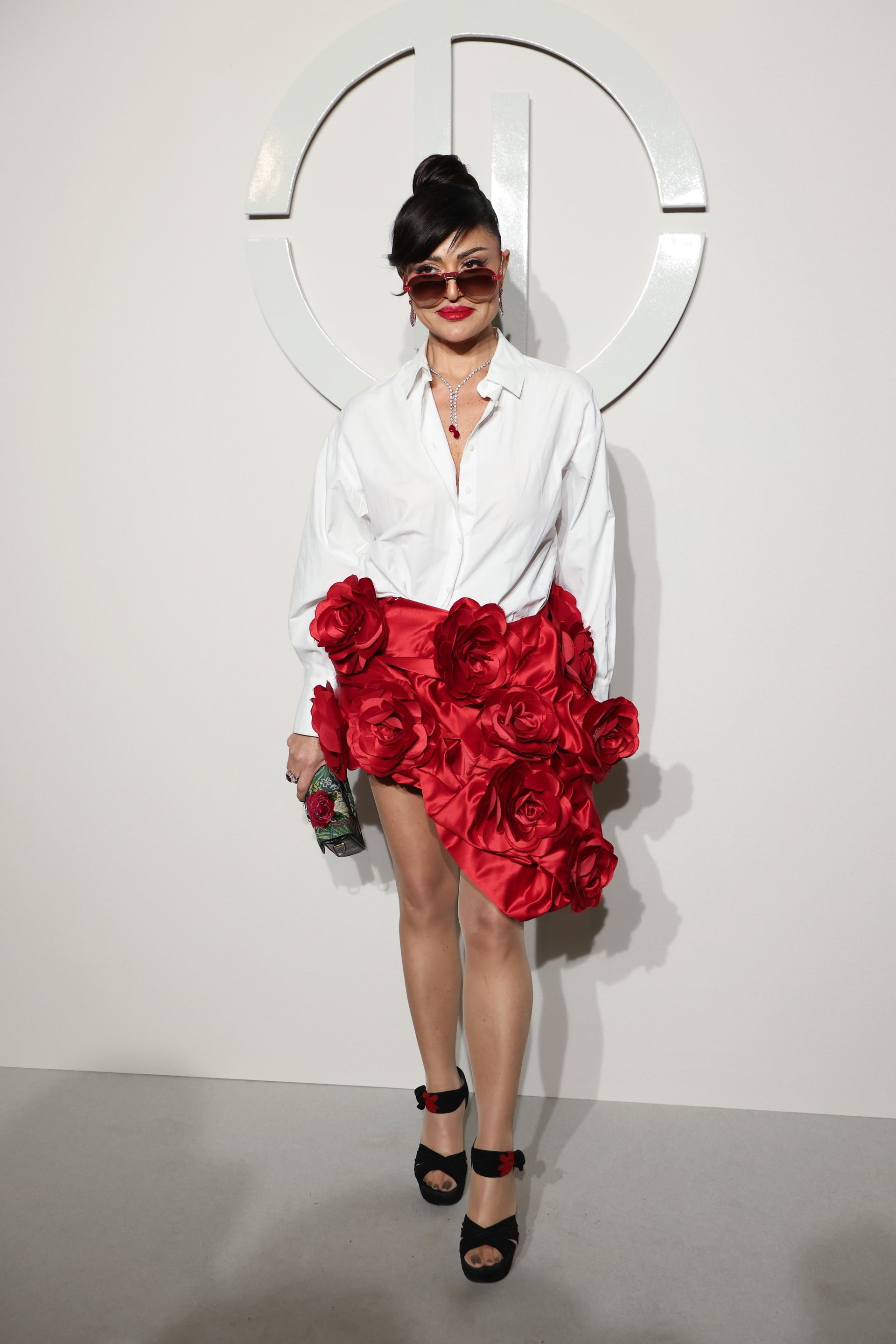 واختارت مدوّنة الموضة واللايف ستايل اللبنانية روزي خضر الظهور في إطلالة غريبة تتألف من قميص أبيض كلاسيكي، وتنورة حمراء مزينة بالورود الضخمة، مع حذاء أحمر بكعب عالٍ، وتسريحة شعر مرفوعة، ونظارات شمسية تظهر نصف عينيها، وأحمر شفاه أحمر.