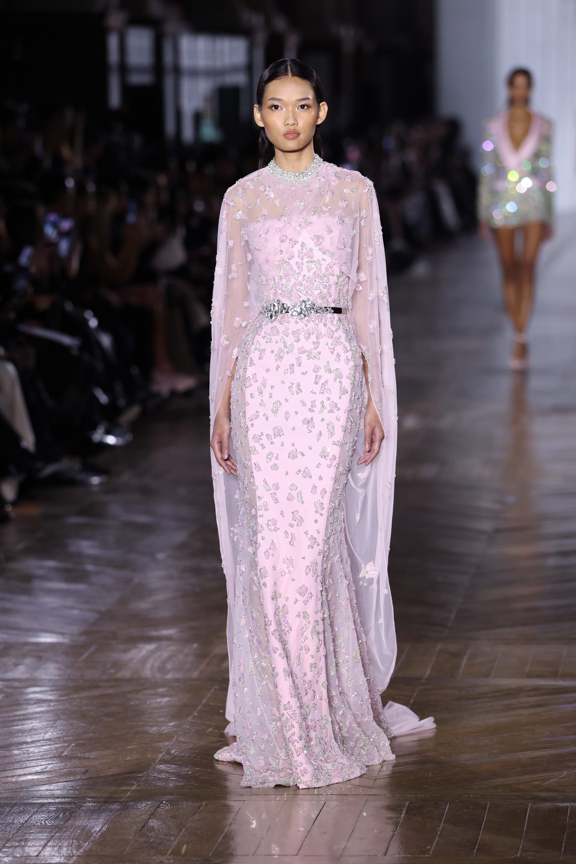 أما الألوان فقد ظهرت عبر انتقالات ناعمة مستوحاة من الضوء المتغيّر، حيث امتزجت الدرجات البلورية والباستيل، مع لمسات معدنية متلألئة، ما منح كل قطعة بُعدًا متجددًا مع الحركة والضوء على المنصّة.