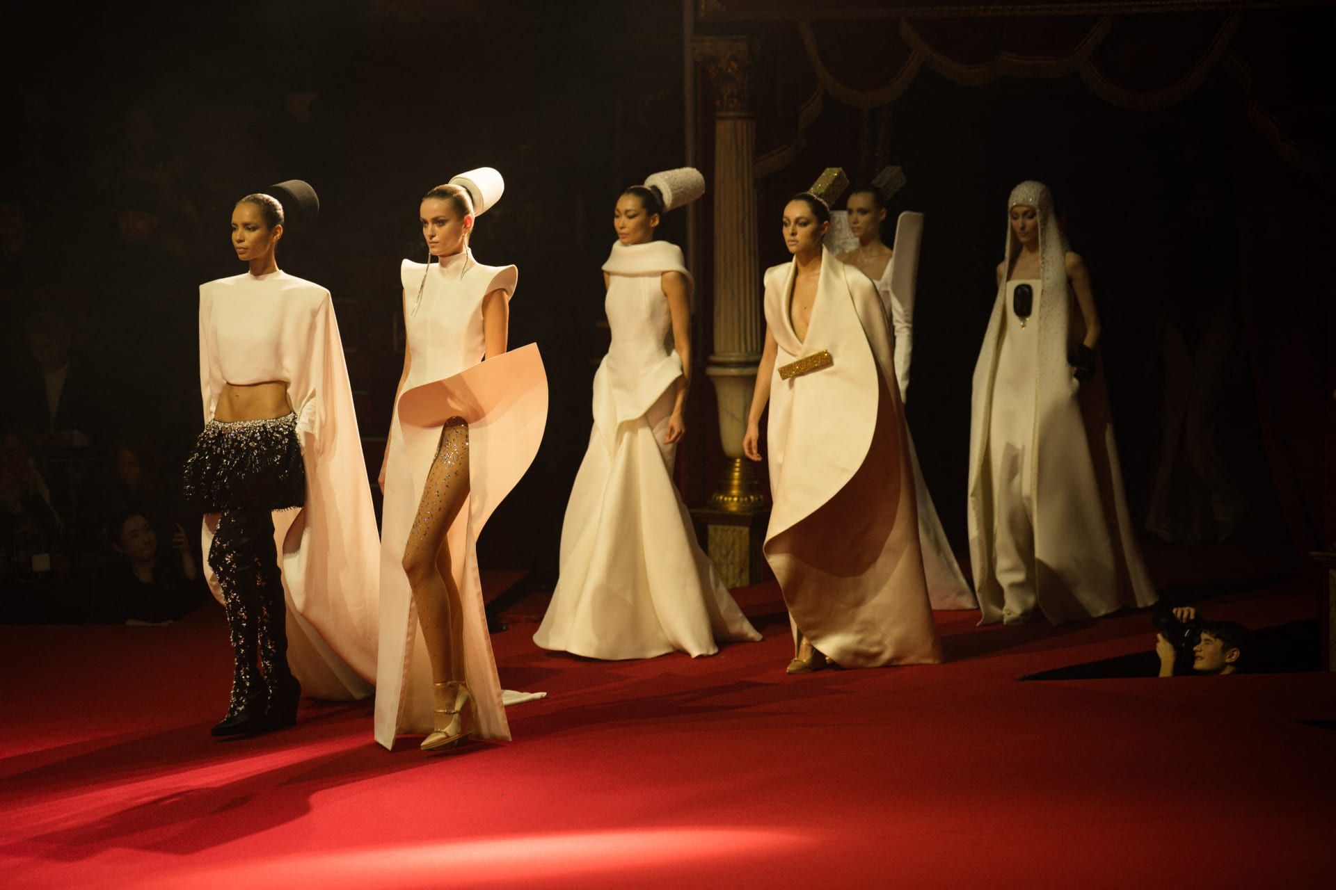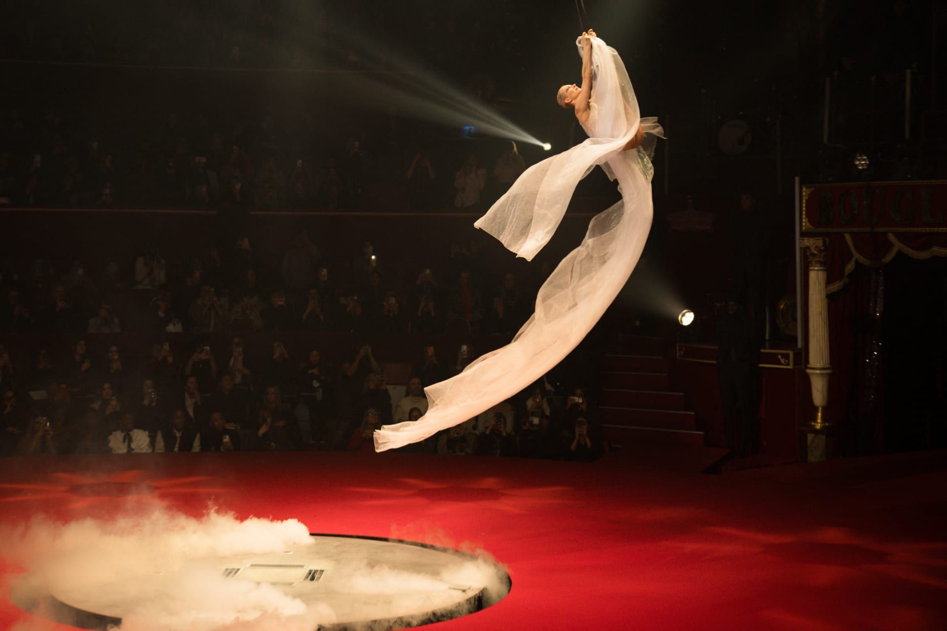 واختتم العرض، الذي أقيم في سيرك "دو إيفر بوجلّيون" في باريس، بمشهد مذهل، حيث حلّقت فنانة السيرك الفرنسية ناتاليا بوغليون في الهواء أمام الجمهور، مرتدية فستانًا مرصعًا بالماس، بحسب ما وصفته الصفحة الرسمية للمصمم الفرنسي على "إنستغرام".