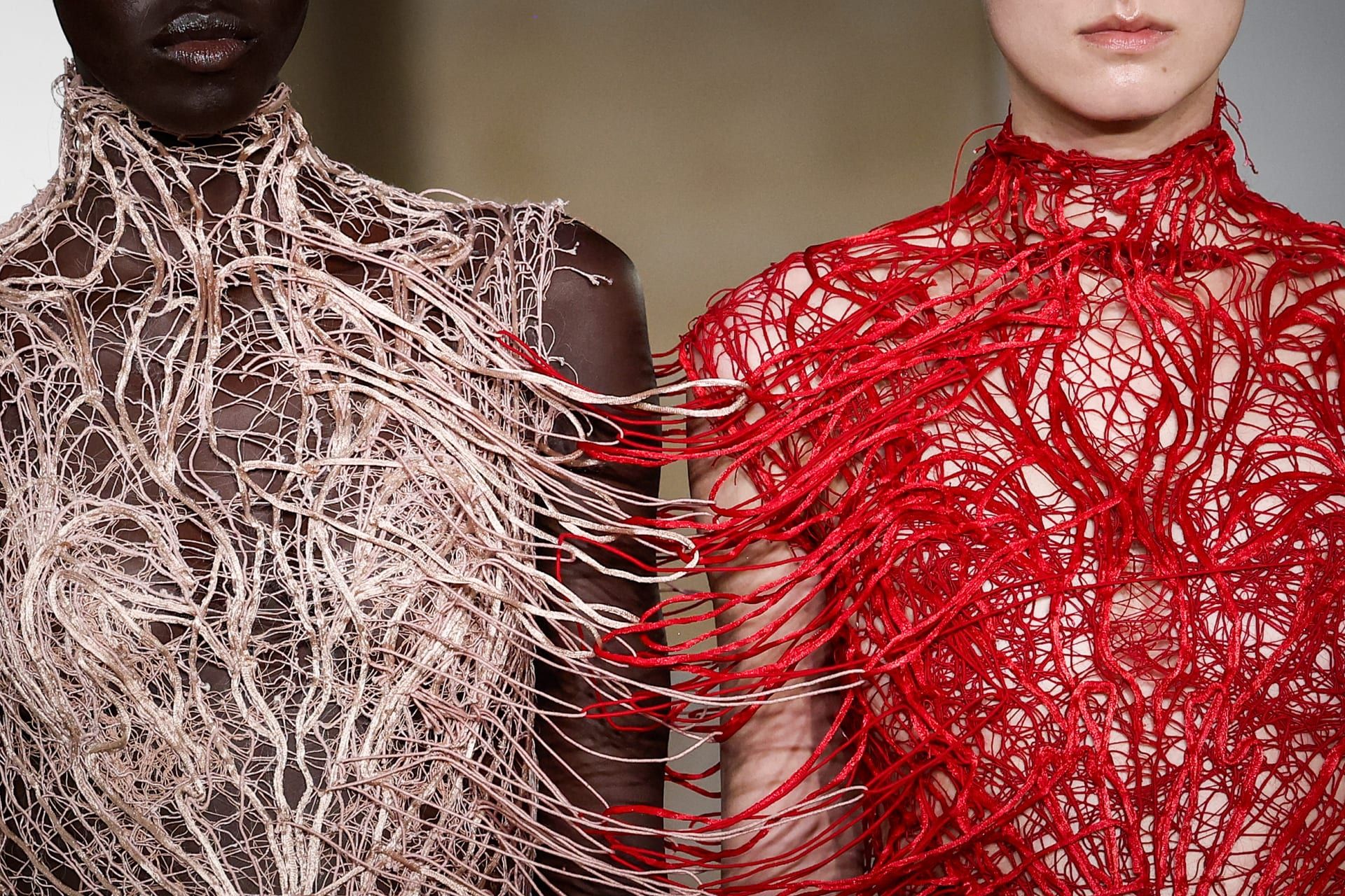 بدلاً من رؤية عارضة واحدة تسير على المنصّة، شهد العرض عارضتين متشابكتين بفساتينهما، حيث تداخلت خيوط الفستان الزهري مع الفستان الأحمر، وسارت العارضتان معًا على خطى واحدة.