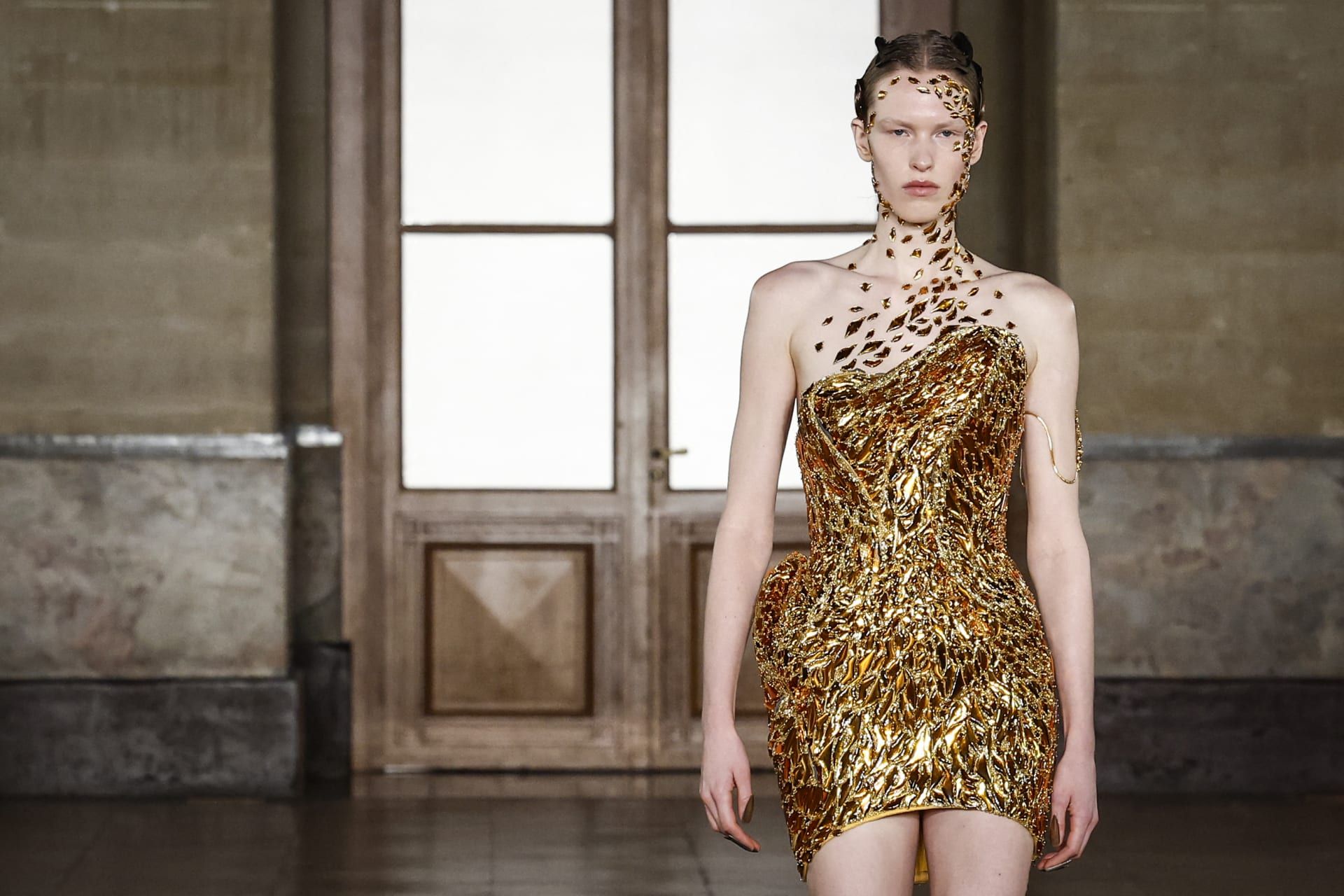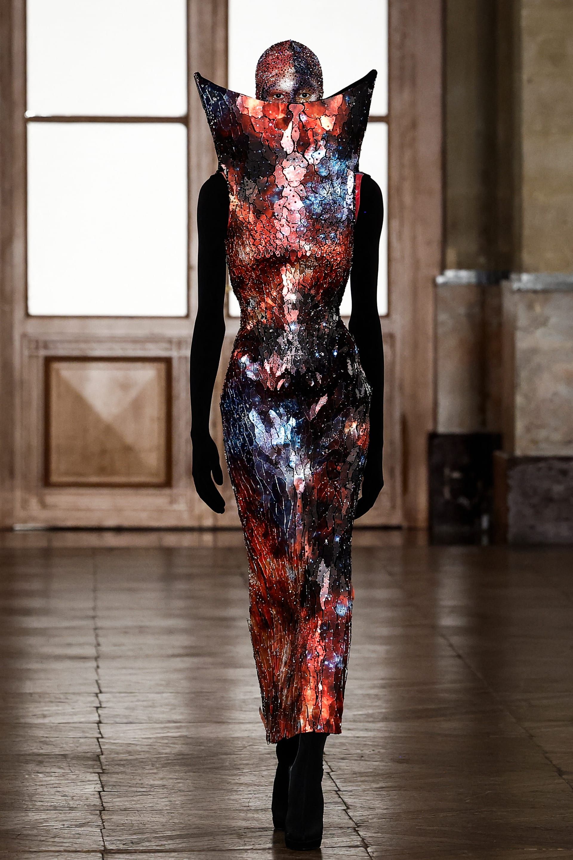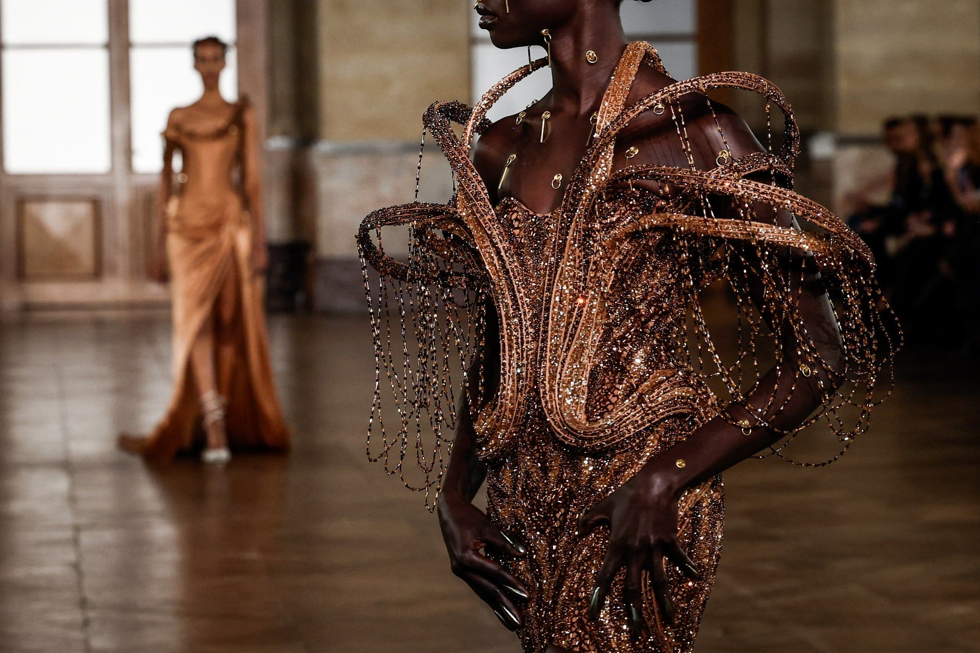 تميز عرض غوبتا بالتصاميم التي تتدفق بسلاسة، حيث امتزجت المشدات مع الطيات بشكل متناسق، وتحولت القصات المعمارية للأكتاف إلى أشكال منسدلة، لتظهر الملابس وكأنها تتحرك مع الجسم.