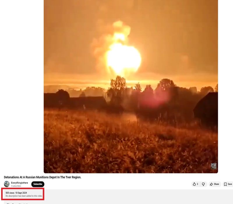 بتقسيم الفيديو إلى لقطات ثابتة واستخدام البحث العكسي، عثرنا على نسخة من الفيديو منشورة في موقع يوتيوب بتاريخ 18 سبتمبر/أيلول 2024. وكان الوصف المُصاحب له يقول: "انفجارات في مستودع ذخيرة روسي في منطقة تفير".