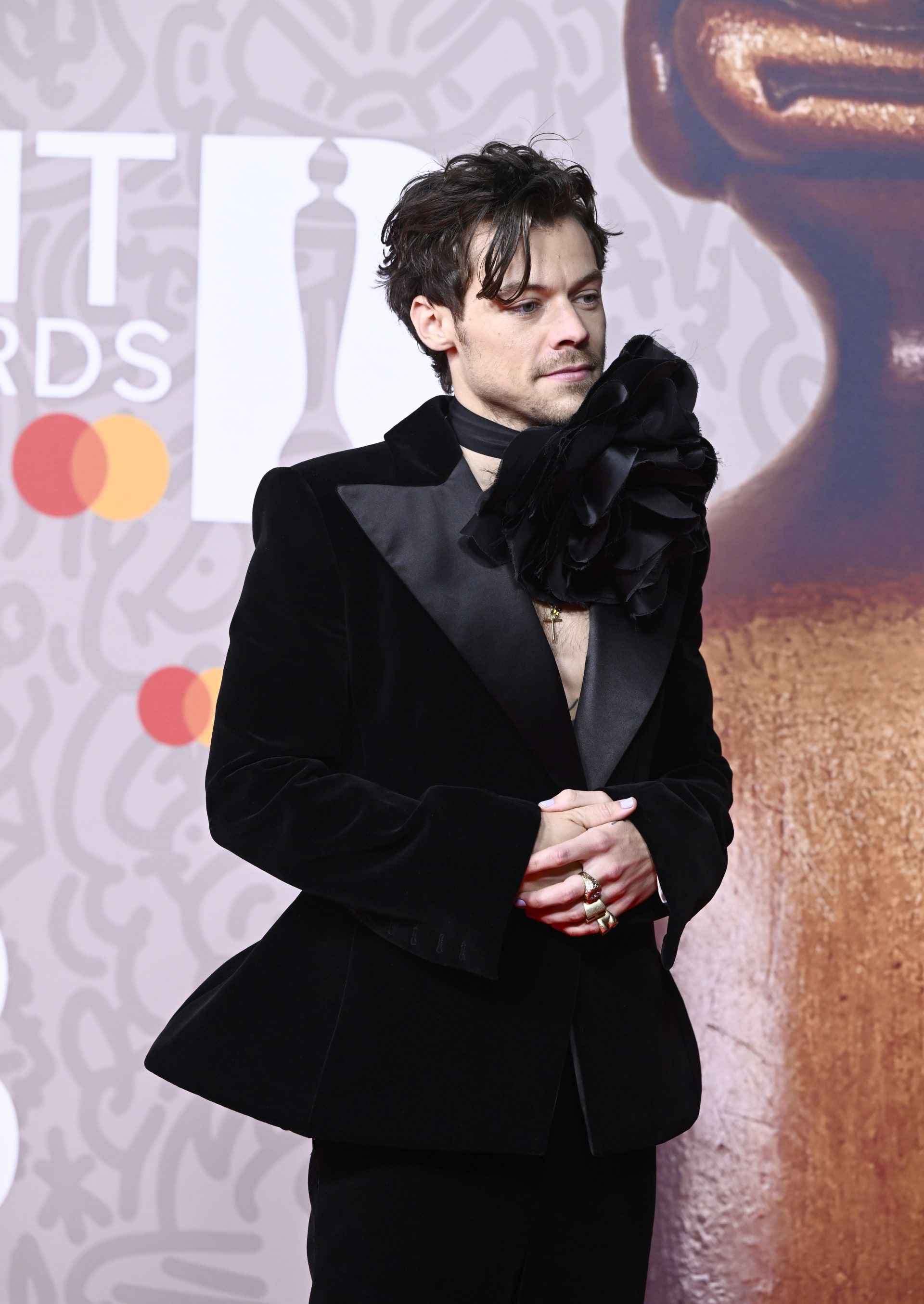 كما لفت ستايلز الأنظار على السجادة الحمراء في حفل جوائز "بريت أووردز" بإطلالة مميزة، حيث ارتدى بدلة مخملية سوداء بقصة أنثوية، مع إكسسوار ضخم لفّه حول العنق على شكل وردة.