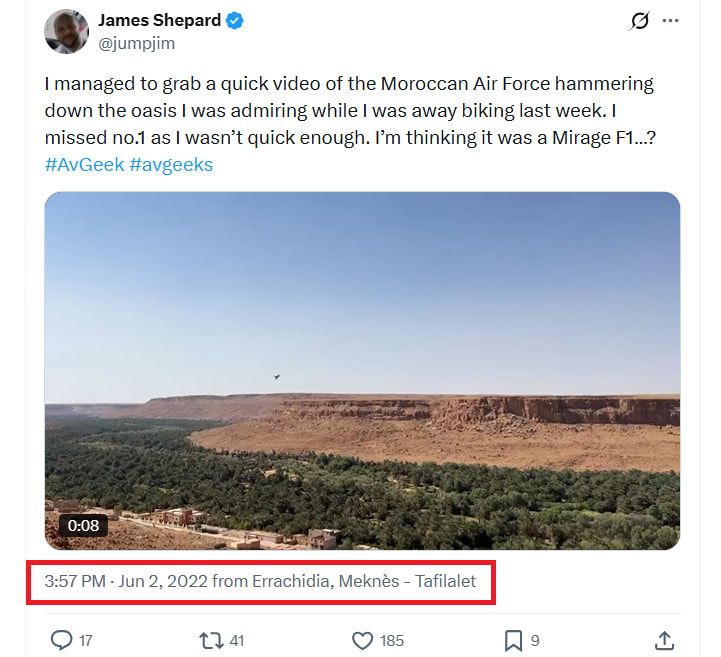 آنذاك، كتب ناشر الفيديو: "تمكنتُ من التقاط فيديو سريع لسلاح الجو المغربي... أثناء رحلتي بالدراجة الأسبوع الماضي".