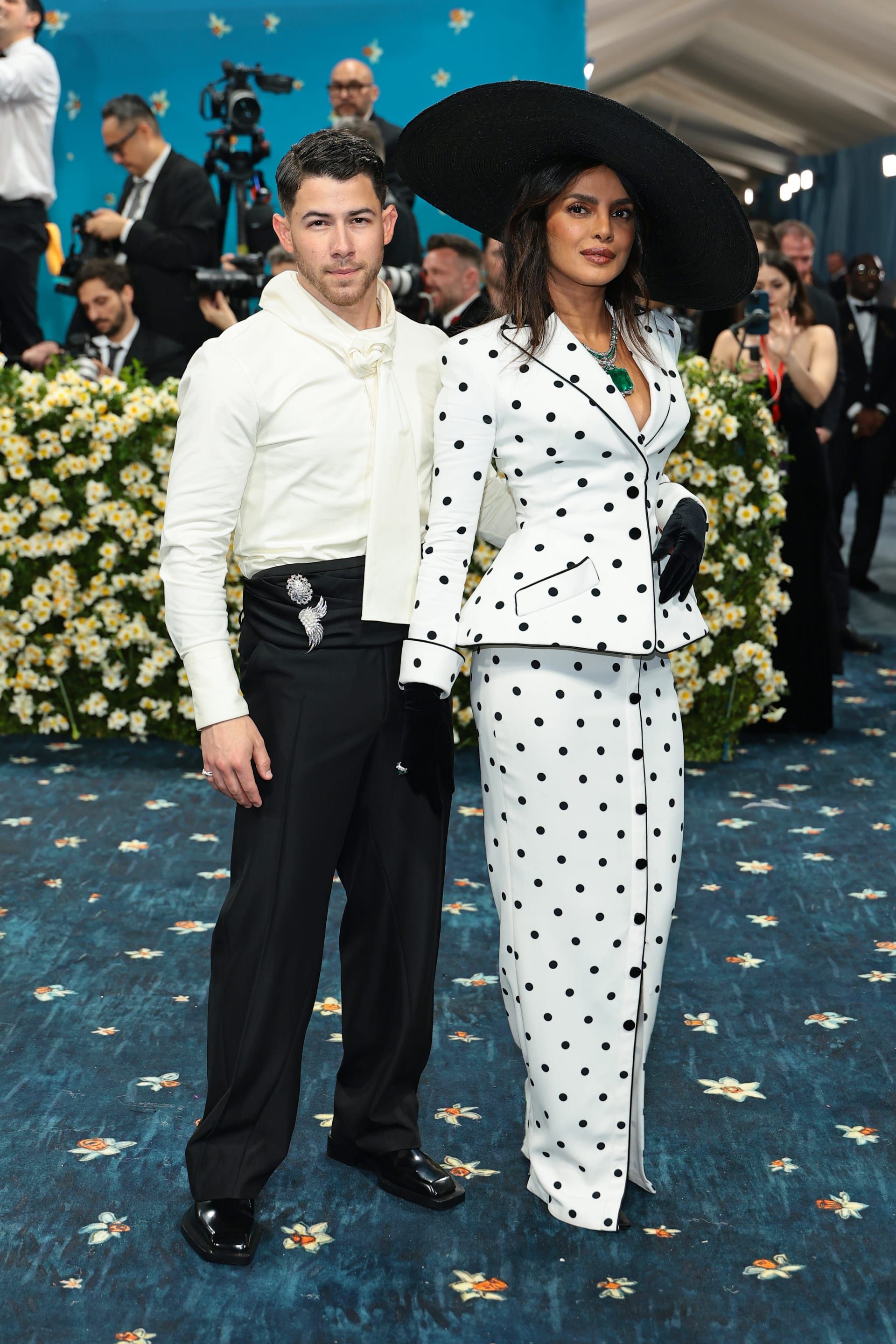كذلك الأمر في حفل "ميت غالا" لعام 2025، حيث اختارت شوبرا بدلة بيضاء مؤلفة من جاكيت وتنورة مزينة بنقشة "بولكا دوت" السوداء، بينما نسّق جوناس إطلالته بالألوان ذاتها.