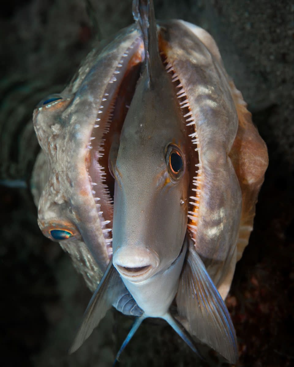 تُظهر الصورة، التي وثّقها جينسن في ولاية فلوريدا الأمريكية عام 2023، سمكة جَرّاح تبدو هادئة بشكلٍ مضحك رُغم تواجدها بين فكّي سمكة سحلية كانت تحاول التهامها.