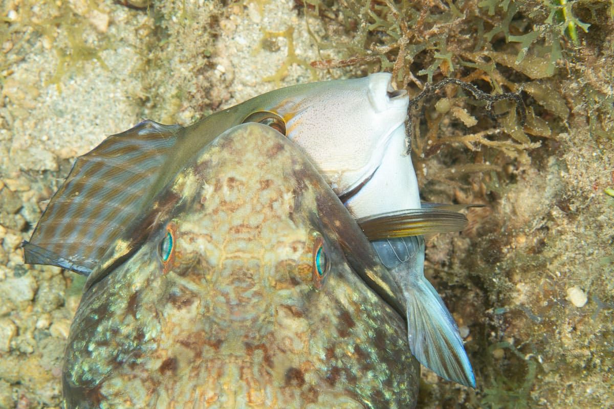 كانت سمكة السحلية تواجه وقتًا عصيبًا لاصطياد وجبتها، إذ قال المصور الأمريكي في مقابلةٍ مع موقع CNN بالعربية: "تمتلك سمكة الجَرّاح أشواكًا دفاعية في زعانفها تمكَّنت من فردها في الوقت المناسب، ومنعها ذلك من أن تتعرض للابتلاع بالكامل".