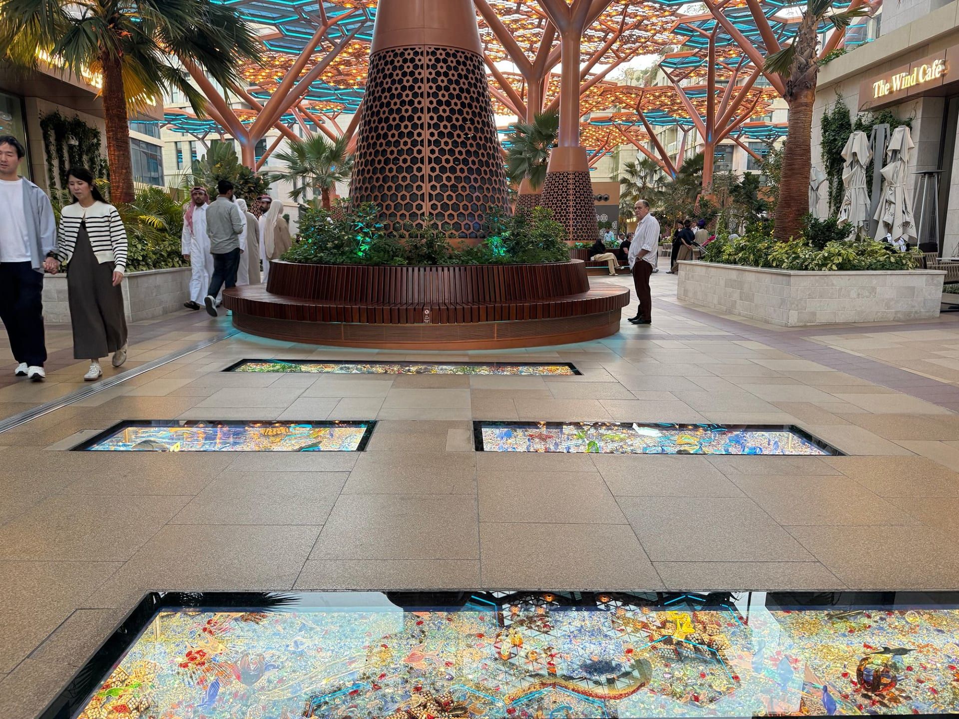 كما توجد ألواح بلورية مدمجة في أرضية الممشى، نحو 180 صندوقًا مستطيلًا، مضاءة ومحمية بزجاج قوي. وداخلها عروض فنية دقيقة لمناظر طبيعية وحيوانات ومدن وصناعات، منظّمة وتتراوح بين مواضيع الصحراء، والثلج، والغابة، والبحر والآلات. ويصادف الزوار أسراب أسماك وتماسيح ومستعمرات بطاريق، إضافة إلى رموز محلية مثل قوافل الجمال والآلات الموسيقية.