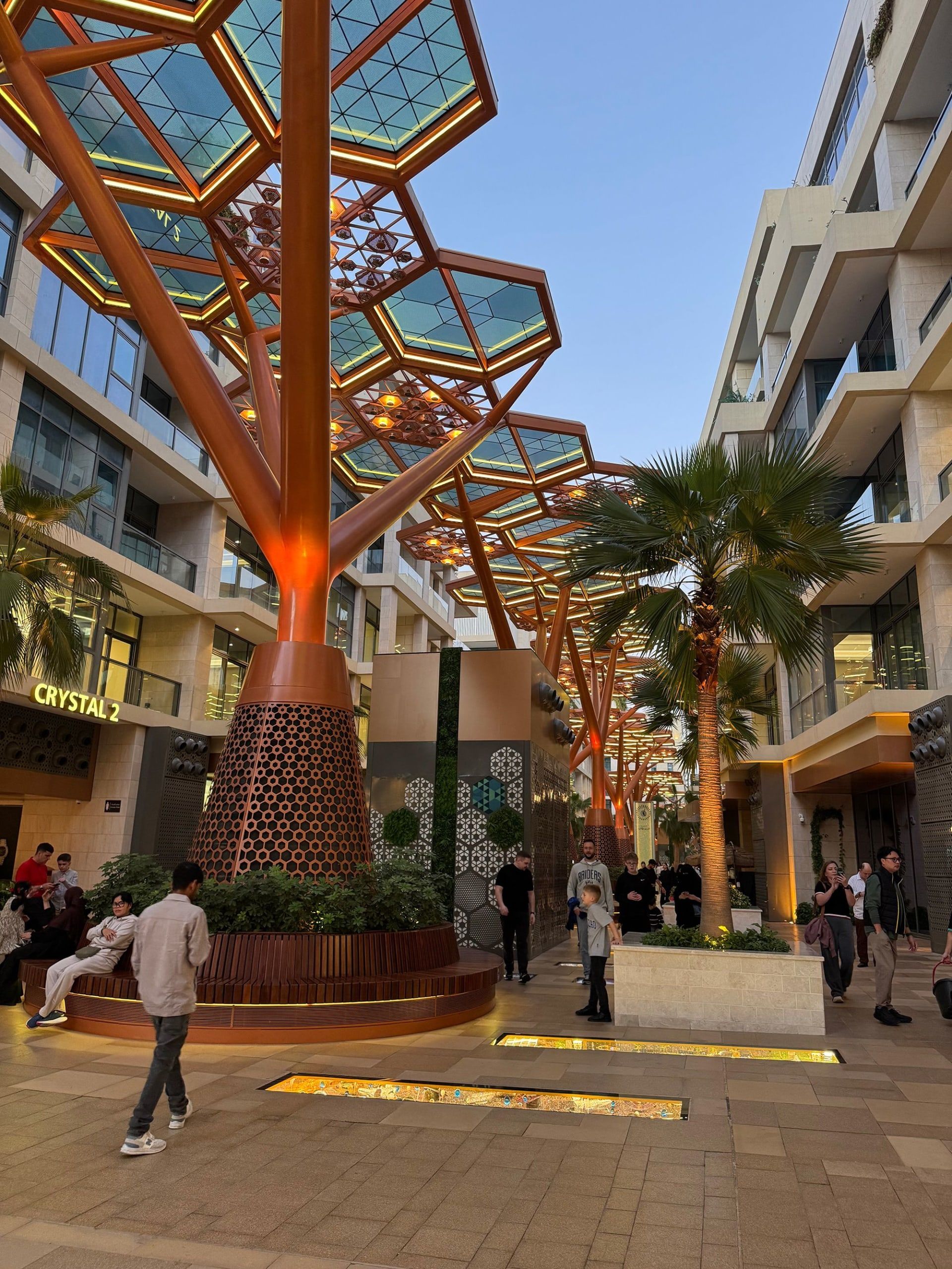 لكن جزيرة جيوان ترتقي بالفكرة إلى مستوى آخر. إذ أن "ممشى الكريستال" يوفّر الظل عبر فروع اصطناعية مغطاة بعشرة أطنان من البلورات التي منحته اسمه. كما تستخدم هذه الهياكل ألواحًا شمسية لتحويل أشعة الشمس الساطعة إلى كهرباء تساعد على تشغيل أنظمة التكييف. وتوجد كذلك نوافير مياه صغيرة للرشّ والانتعاش.