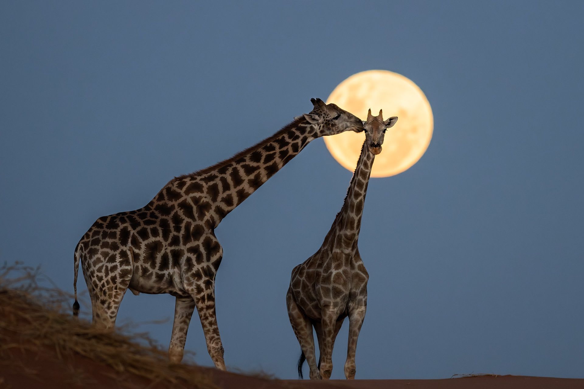 وأدرك غوتش أنّ الزرافة ستمر مباشرة أمام القمر المنخفض في الأفق، فالتقط كاميرته وحامله الثلاثي واندفع مسرعًا إلى موقع التصوير قبل فوات الأوان.