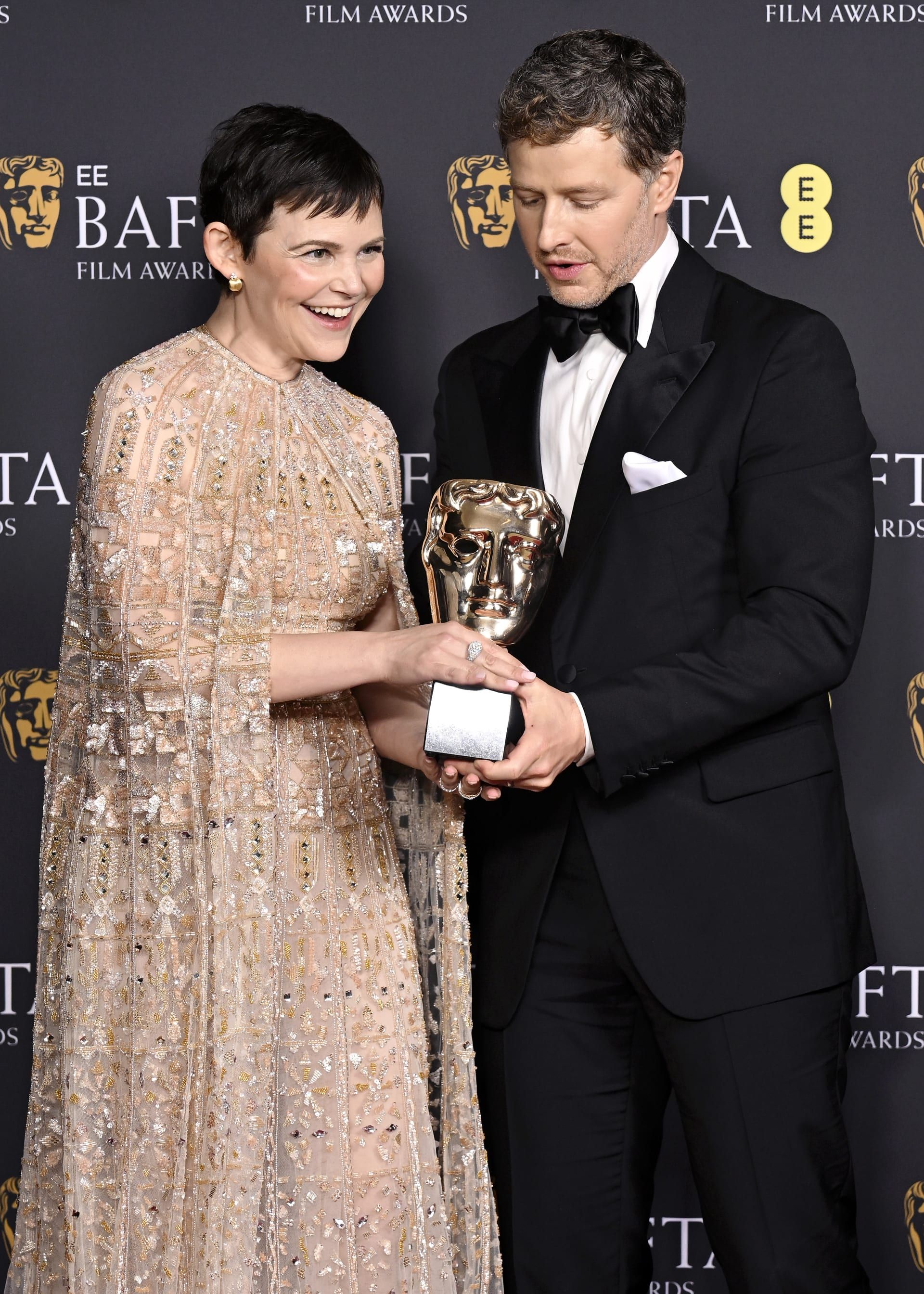 اختارت الممثلة الأمريكية جينيفر غودوين فستاناً ذهبي اللون بتدرج ألوان الشامبانيا، مزيناً بتطريزات هندسية من الخرز، بياقة عالية ومشلح طويل ينسدل حتى الأرض، من مجموعة المصمم اللبناني زهير مراد للأزياء الجاهزة لربيع 2026