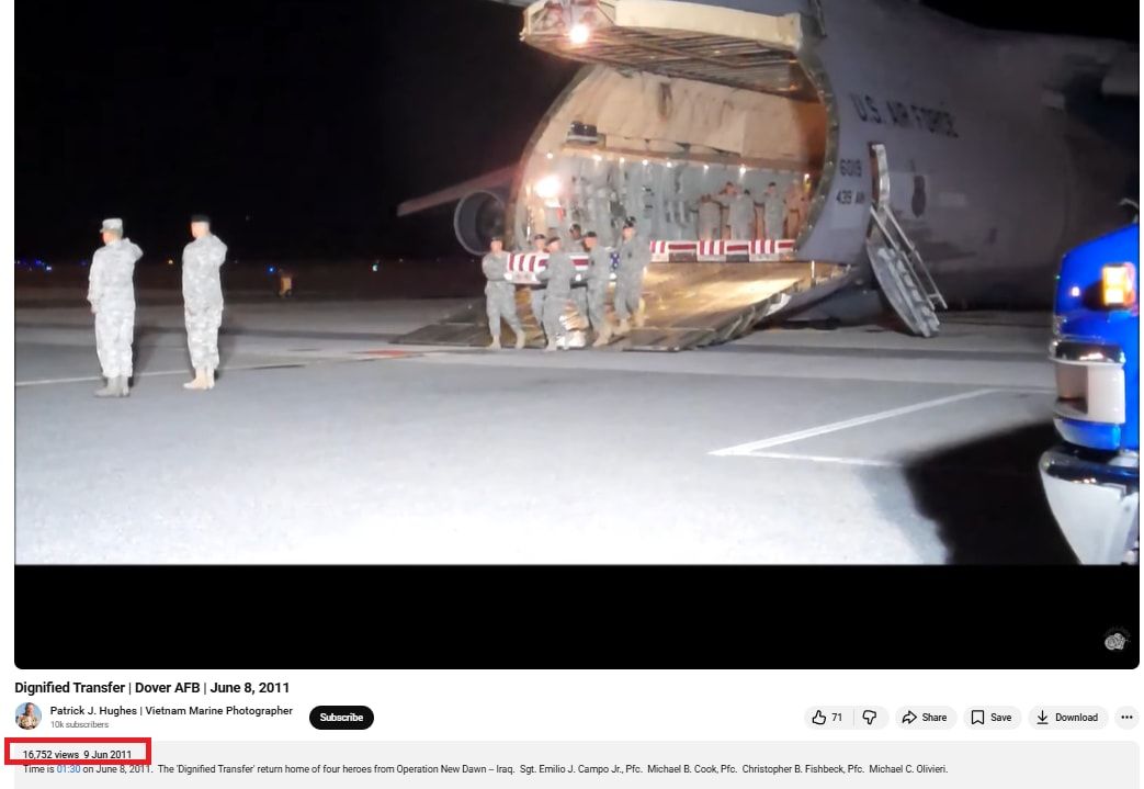 وبتاريخ 9 يونيو/حزيران 2011، نشر الفيديو في موقع يوتيوب، فيما كان التعليق الوصفي للمقطع يقول: "الساعة 1:30 صباحًا، 8 يونيو 2011. عودةٌ كريمة لأربعة أبطال من عملية الفجر الجديد في العراق: الرقيب إميليو ج. كامبو الابن، والجندي مايكل ب. كوك، والجندي كريستوفر ب. فيشبيك، والجندي مايكل س. أوليفيري".