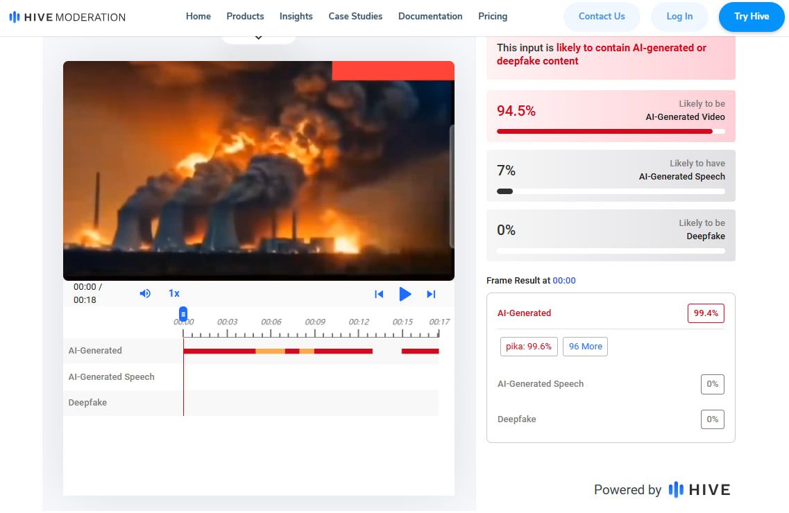 وأظهرت نتائج فحص الفيديو عبر أداة Hive Moderation، المعنية بفحص المواد المُنتجة بالذكاء الاصطناعي، أنه من المرجح إنشائه بهذه التقنيات بنسبة 94.5%.