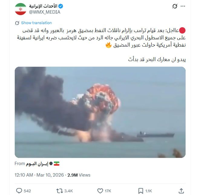 اخبار العرب -كندا 24: الخميس 12 مارس 2026 04:39 صباحاً دبي، الإمارات العربية المتحدة (CNN)-- انتشر فيديو عبر وسائل التواصل الاجتماعي، باعتباره لهجوم إيراني على ناقلة نفط أمريكية في مضيق هرمز، تزامنًا مع تصاعد أزمة الملاحة البحرية في الممر الملاحي الحيوي جراء غلقه من قبل إيران.