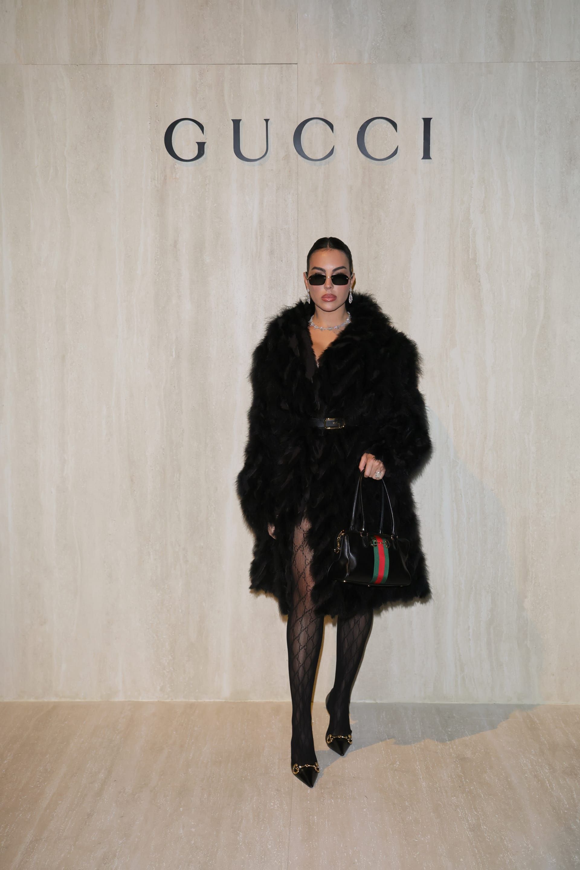 ارتدت رودريغيز معطف فرو ضخمًا من مجموعة ما قبل خريف 2026، شكّل القطعة الأساسية في الإطلالة. ونسّقت معه حزامًا أسود بتصميم مربع، إضافة إلى جوارب دانتيل مزينة بشعار “Interlocking G”، الذي يُعد من الرموز الكلاسيكية لـ"غوتشي".