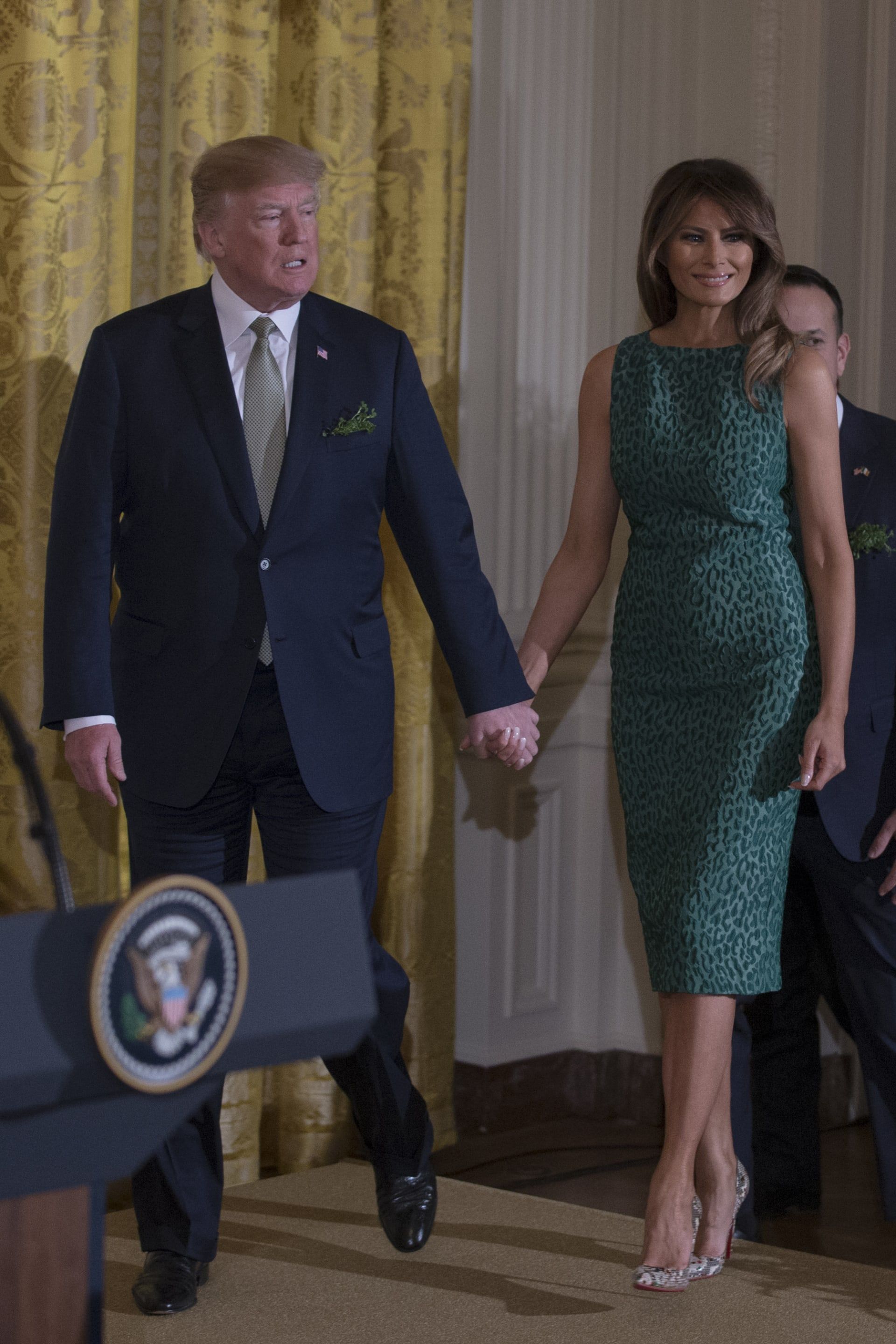 كما ارتدت فستانًا أخضر بنقشة الفهد خلال احتفال عيد القديس باتريك في البيت الأبيض في العام ذاته، ونسقت معه حذاء بكعب عالي من جلد الثعبان.