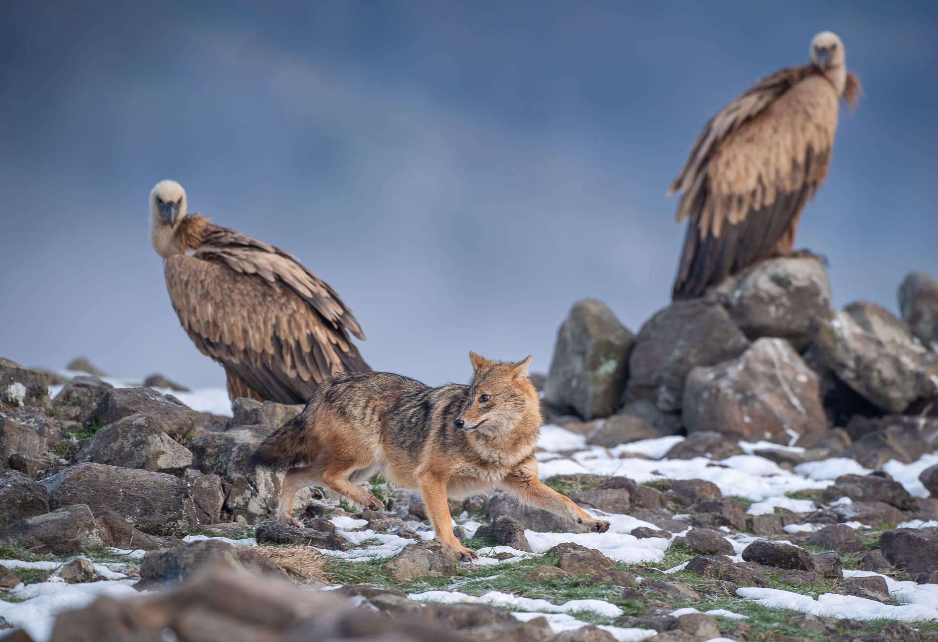بالفعل، وثّق المصور البريطاني بعدسته لحظة صراعٍ محتدم بين نسرٍ من نوع "غريفون" وابن آوى ذهبي حول جيفة.