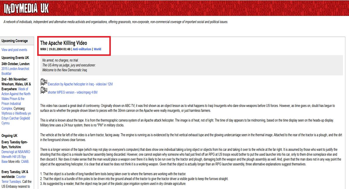 ونشر موقع "إندي ميديا" البريطاني للإعلام المستقل، الفيديو في 19 يناير/كانون الثاني 2004، قائلا إنه "عُرض في البداية على قناة ABC التلفزيونية، كدرسٍ عمليٍّ لما يحدث للمتمردين العراقيين الذين يجرؤون على إظهار أسلحتهم أمام القوات الأمريكية. مع ذلك، ومع مرور الوقت، بدأت الشكوك تحوم حول ما إذا كان الأشخاص الذين ظهروا وهم يُفجَّرون إربًا إربًا بمدفع عيار 30 ملم على متن مروحية أباتشي متمردين بالفعل، أم مجرد مزارعين مسالمين؟"، بحسب الموقع.