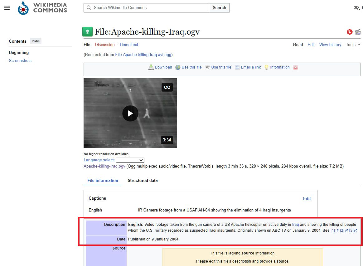 وأورد موقع ويكي ميديا، التابع لموسوعة ويكيبديا العالمية، الفيديو وأشار إلى أنه " مُلتقطة بكاميرا مثبتة على مروحية أباتشي أمريكية أثناء خدمتها في العراق، تُظهر قتل أشخاص اعتبرهم الجيش الأمريكي مشتبهين بانتمائهم إلى المتمردين العراقيين".