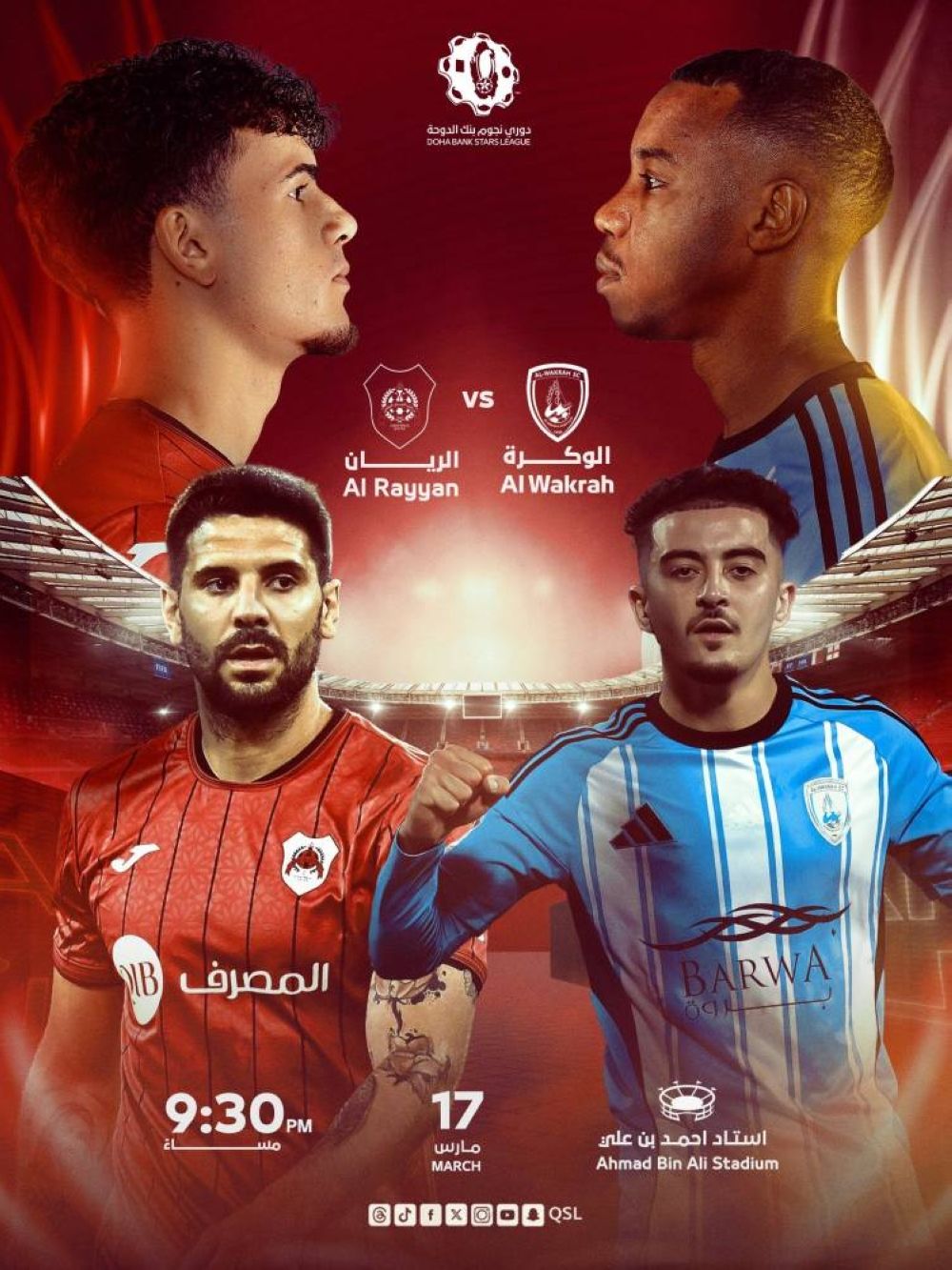 الاثنين 16 مارس 2026 07:40 مساءً يشهد استاد أحمد بن علي بنادي الريان مساء الثلاثاء الموافق 17 مارس 2026 مواجهة مرتقبة تجمع بين فريقي الريان والوكرة ضمن منافسات الأسبوع التاسع عشر من دوري نجوم بنك الدوحة لكرة القدم، وذلك عند الساعة التاسعة والنصف مساءً، في لقاء يتوقع أن يتسم بالقوة والندية في ظل طموحات الفريقين لتحسين موقعهما في جدول الترتيب.