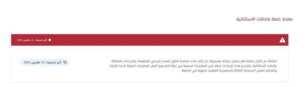 الثلاثاء 17 مارس 2026 07:40 مساءً حرصًا على سلامة أسرة جامعة قطر وتعزيز جاهزية الجميع في الحالات الطارئة، يوفر موقع الجامعة الإلكتروني صفحة خاصة بالحالات الاستثنائية، تضم أحدث المعلومات والإرشادات والروابط المهمة للمجتمع الجامعي