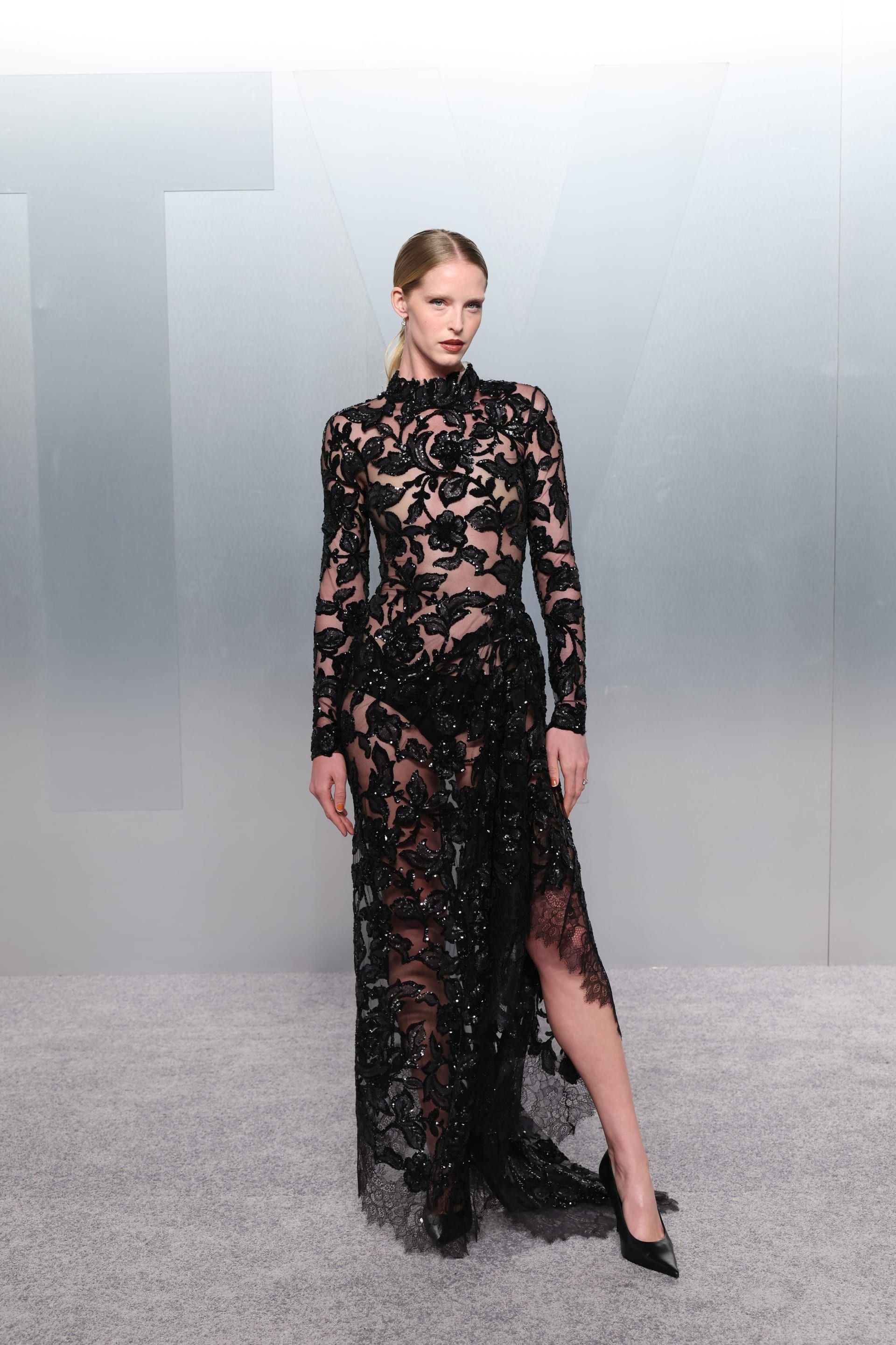 كما وقع اختيار العارضة الأمريكية آبي شامبيون على صعب أيضًا، حيث ارتدت فستانًا أسود بقماش الدانتيل الشفاف، مع تطريزات زهرية لامعة على طول الفستان، وأكمام طويلة، وياقة عالية.