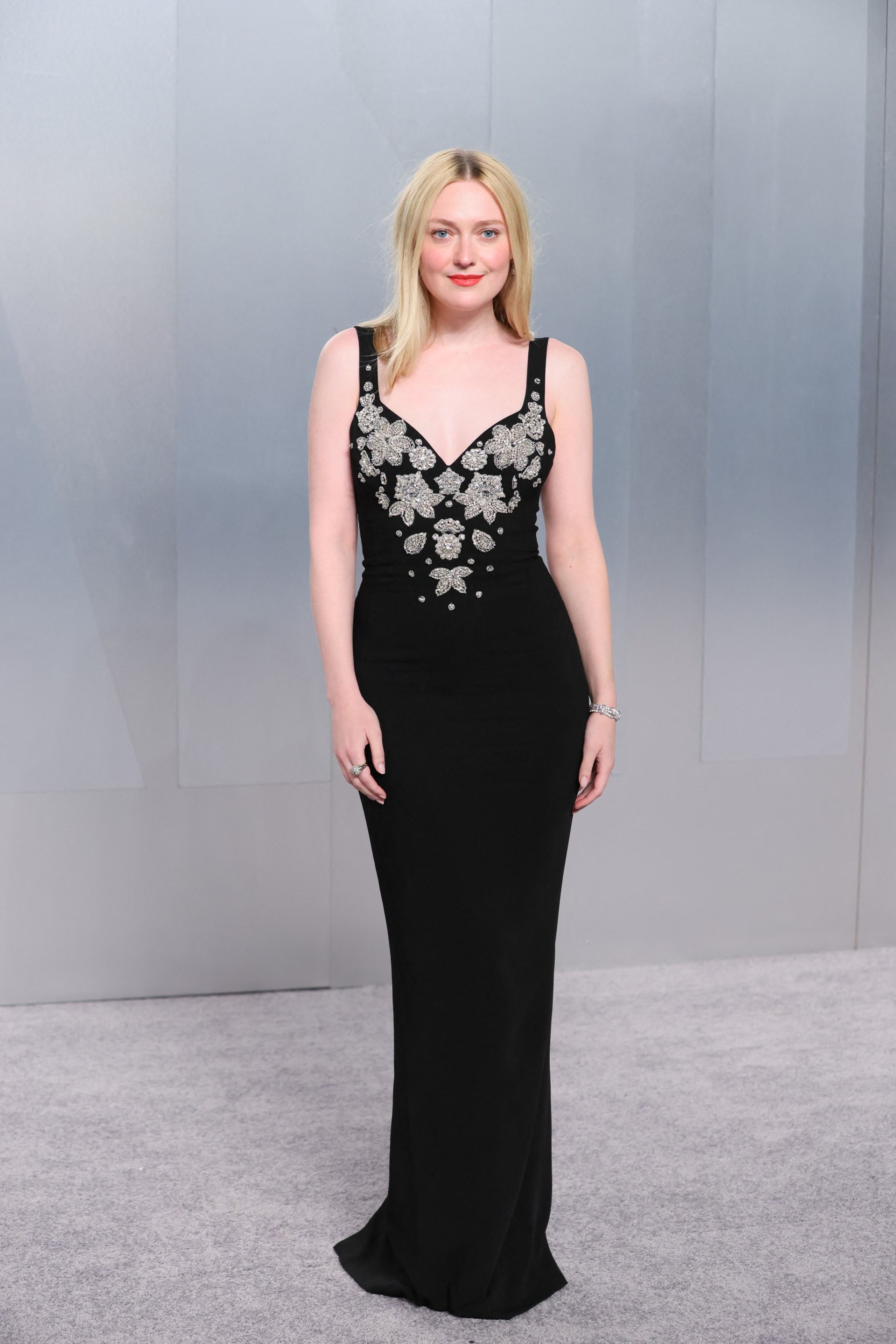 اختارت الممثلة الأمريكية داكوتا فانينغ فستانًا أسود من مجموعة مراد للألبسة الجاهزة لربيع 2026، في الحفل ذاته، تميّز بفتحة صدر عميقة، وتطريزات فضية دقيقة على شكل أزهار غطّت منطقة الصدر.