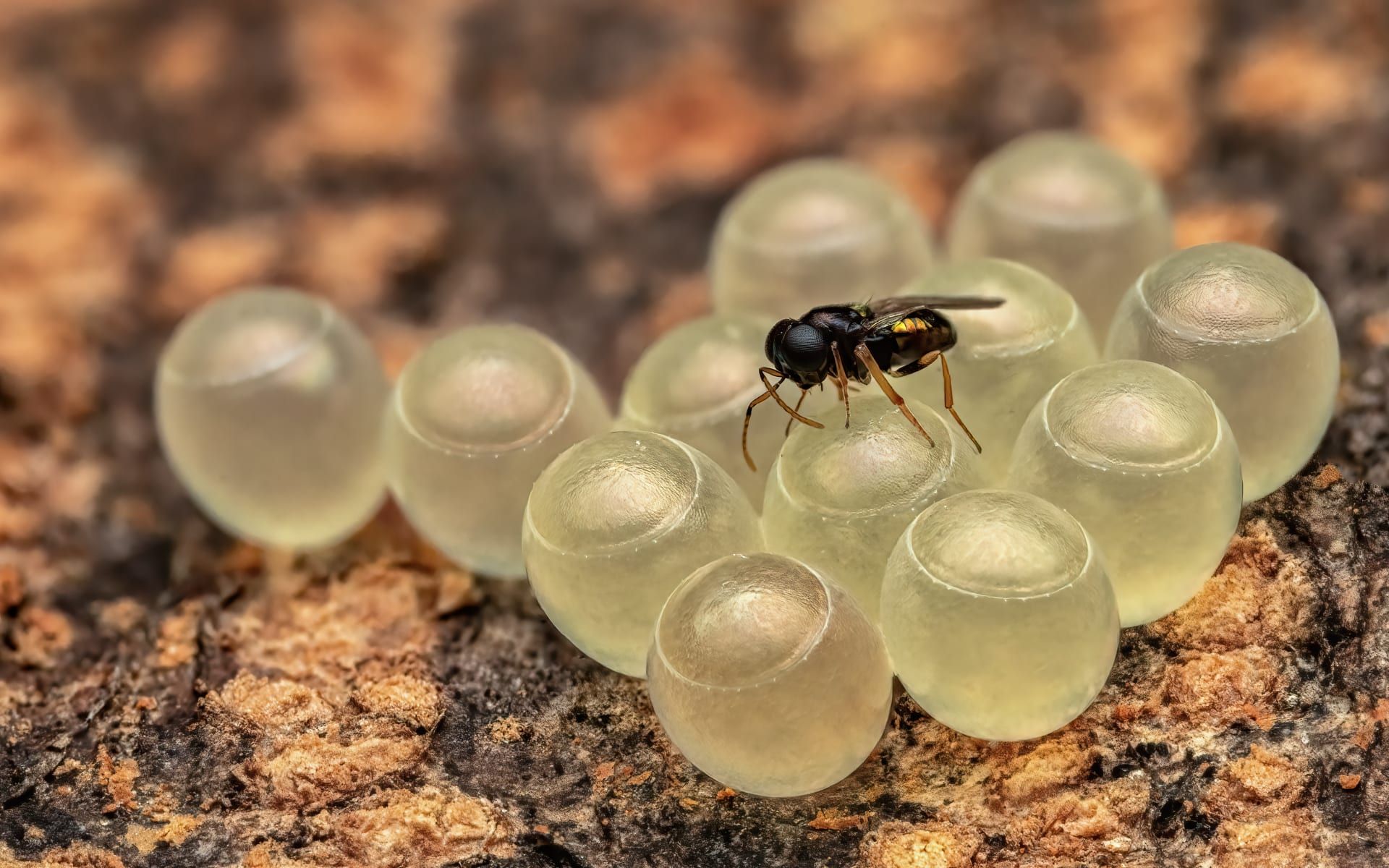 عند رؤية اللقطة لأول مرة، قد يظن المرء أنّه ينظر إلى قطع حلوى ملوّنة تُركت فوق ورقة موز. لكنها في الحقيقة بيوض فراشة، لم تكن آمنة كما تبدو، إذ تربّص بها دبور طفيلي لوضع بيضه داخلها.