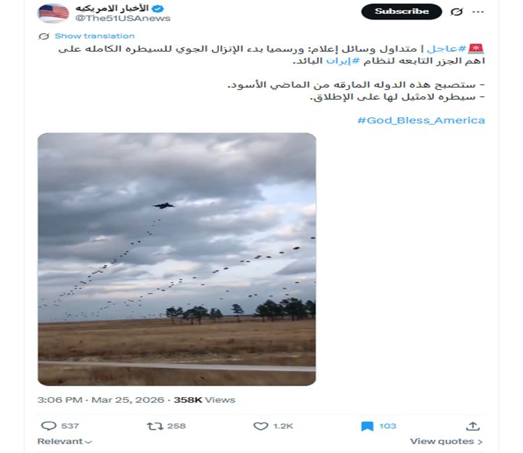 اخبار العرب -كندا 24: الخميس 26 مارس 2026 09:15 صباحاً دبي، الإمارات العربية المتحدة (CNN)-- تداولت حسابات مقطع فيديو في وسائل التواصل الاجتماعي بزعم ارتباطه بلحظة حدوث إنزال جوي أمريكي فوق جزر إيرانية.
