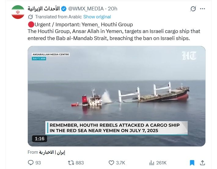 باستخدام البحث العكسي، عثرنا على نسخة من الفيديو الذي وزعته جماعة أنصار الله (الحوثيون) في 9 يوليو/تموز 2025، لهجومها على سفينة "إترنيتي سي" الذي أدى إلى غرقها.