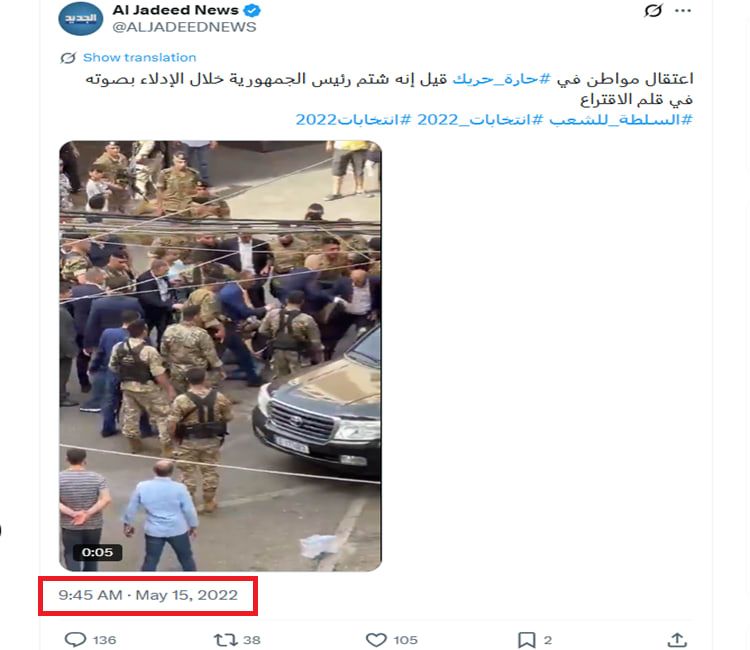 باستخدام البحث العكسي، عثرنا على نسخة من الفيديو في منصة إكس بتاريخ 15 مايو/أيار 2022، إبان إجراء الانتخابات النيابية في لبنان.