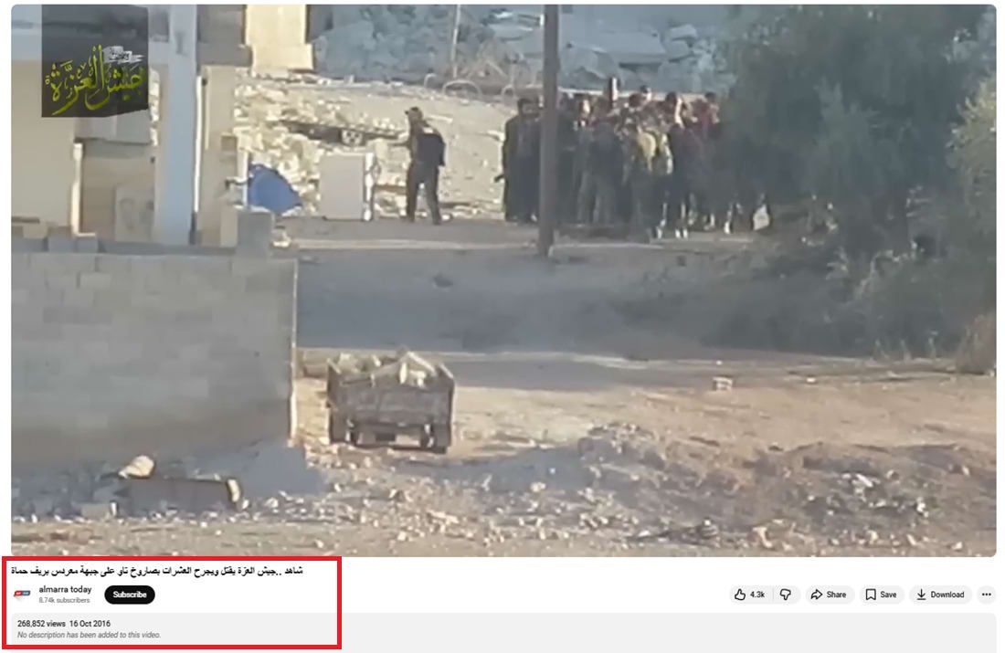 كان عنوان الفيديو الذي اختارته قناة "المعرة اليوم" الناشرة له عبر يوتيوب، هو: "شاهد.. جيش العزة يقتل ويجرح العشرات بصاروخ تاو على جبهة معردس بريف حماة".