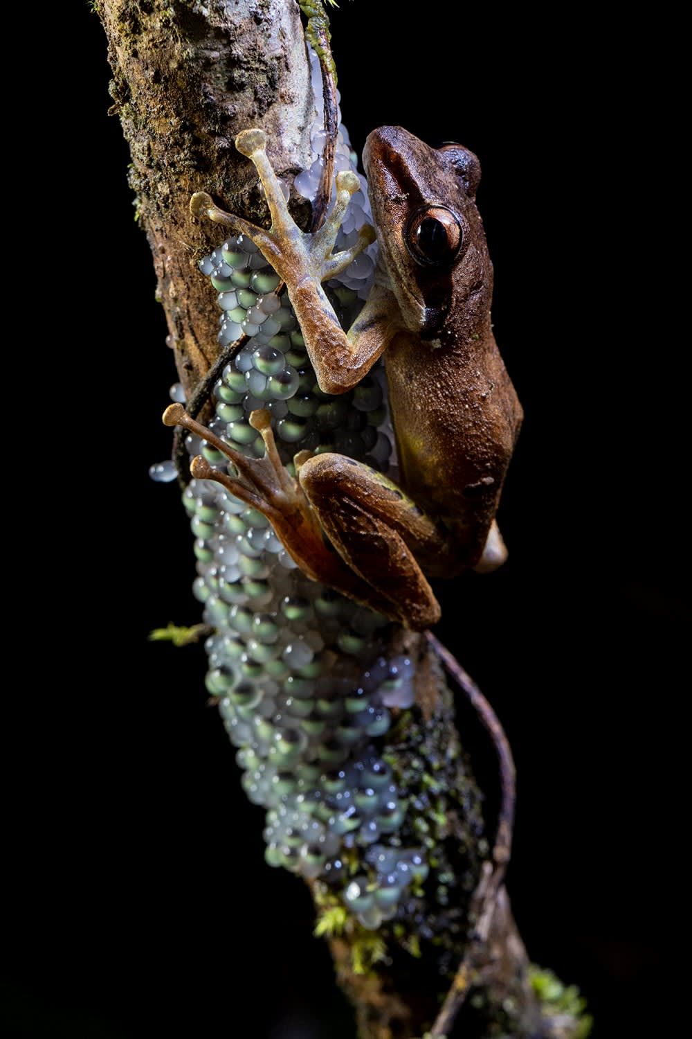 التقط كاروغاتي هذه المشاهد في غابة "ماروميزاها" المطيرة شرق مدغشقر، موثقًا لحظة نادرة من دورة حياة الضفادع، حيث ظهر كيس هلامي معلق من نبتة فوق بركة صغيرة في الغابة.