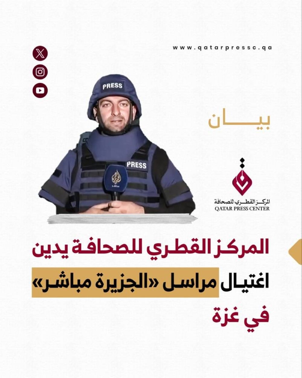 وإذ يُحمّل المركز القطري للصحافة سلطات الاحتلال المسؤولية الكاملة عن هذه الجرائم، فإنه يدعو المجتمع الدولي والمنظمات الدولية والهيئات المعنية بحرية الصحافة والإعلام إلى إدانة هذه الانتهاكات بشكل واضح وصريح، والعمل على ملاحقة مرتكبيها أمام المحاكم الدولية المختصة وتقديمهم للعدالة.