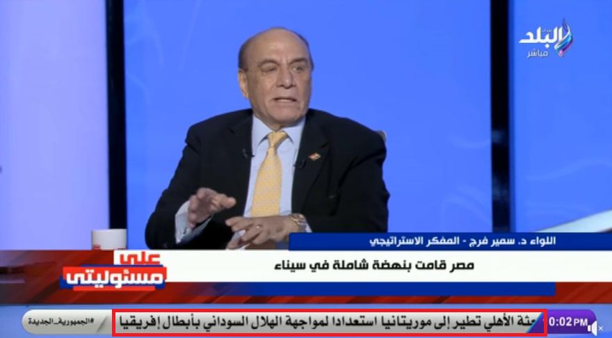 كما يشير شريط الأخبار في قناة "صدى البلد" إلى خبر توجه بعثة النادي الأهلي المصري إلى موريتانيا في 5 أبريل/ نيسان قبيل مواجهة نادي الهلال السوداني، في إياب ربع نهائي دوري أبطال إفريقيا. وحينها فاز الأهلي بهدف نظيف.