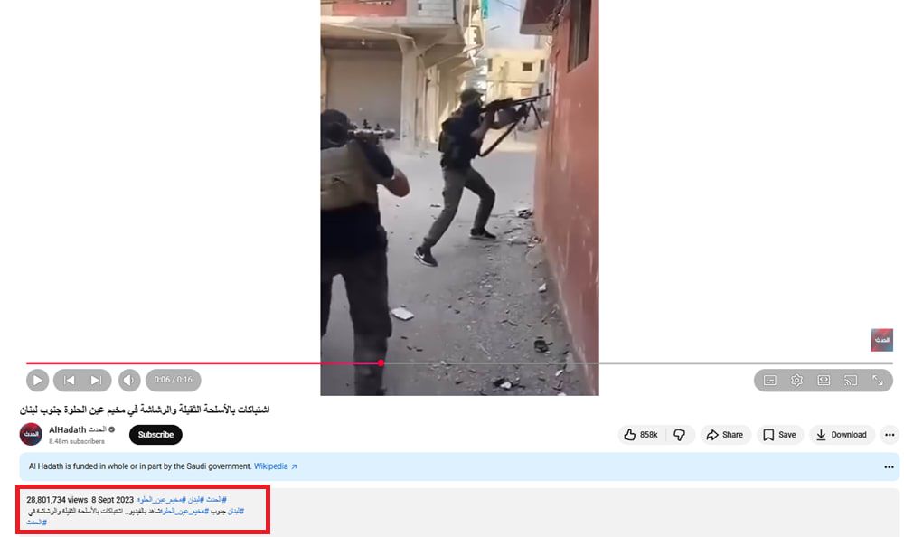 وأوردت قناة "الحدث" نفس المشاهد عبر يوتيوب بتاريخ 8 سبتمبر/أيلول 2023، وكتبت في عنوانها للفيديو: "اشتباكات بالأسلحة الثقيلة والرشاشة في مخيم عين الحلوة جنوب لبنان".