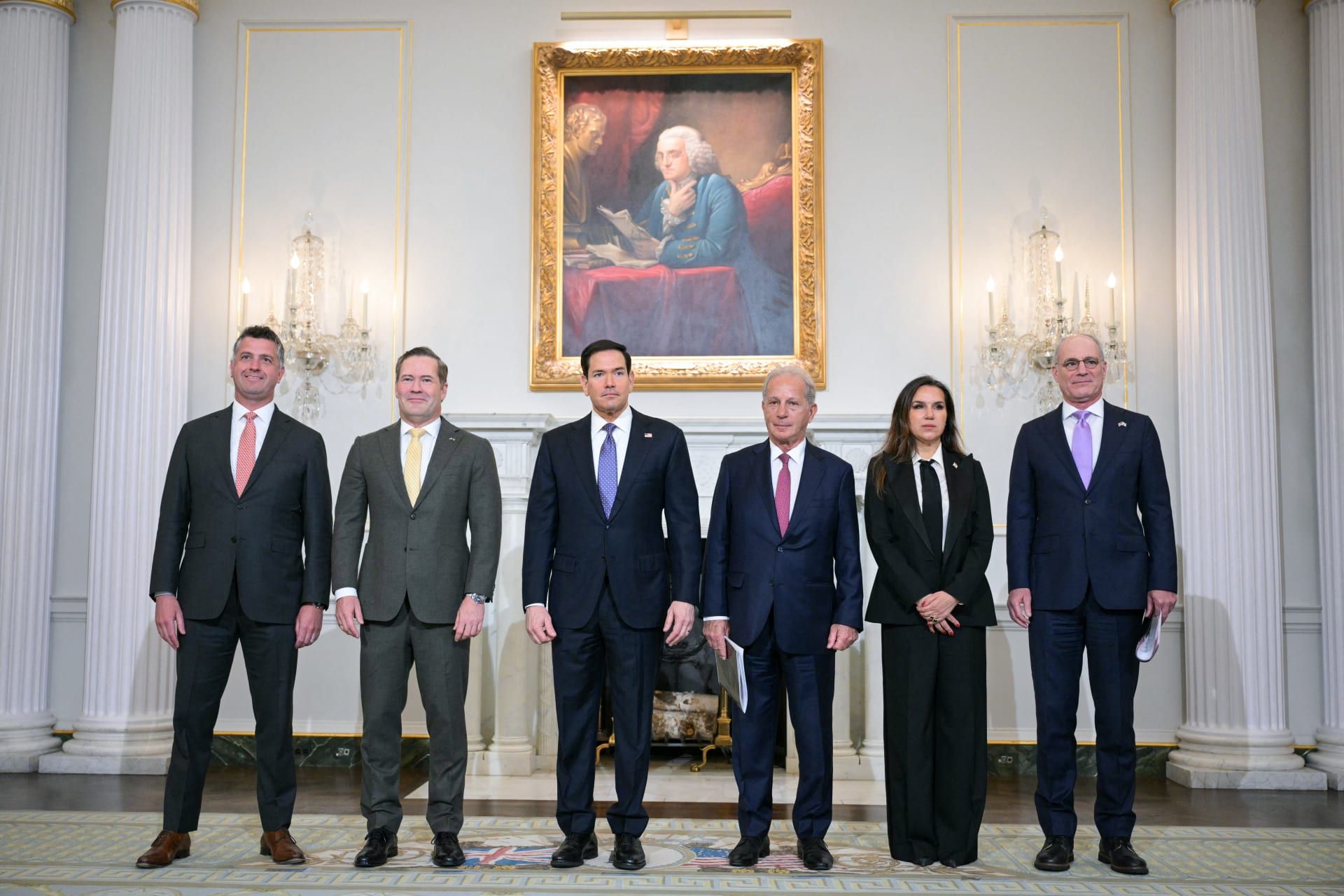 لم يتحدثوا أو يجيبوا على الأسئلة الموجهة إليهم خلال جلسة تصوير، لكن روبيو أدلى بتصريحات مقتضبة في جلسة تصوير ثانية مع الوفود الجالسة على الطاولة.
