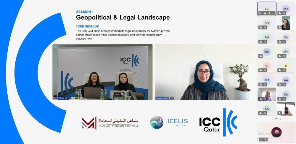 السبت 18 أبريل 2026 06:40 مساءً اختتمت غرفة التجارة الدولية قطر ندوة افتراضية رفيعة المستوى بعنوان: «التعامل مع الأزمة الجيوسياسية: الجوانب القانونية والحوكمة وأولويات الامتثال البيئي والاجتماعي والمؤسسي وإدارة المخاطر للقطاع الخاص في قطر»، بمشاركة أكثر من 200 مشارك من مجتمع الأعمال والمجتمع المهني.