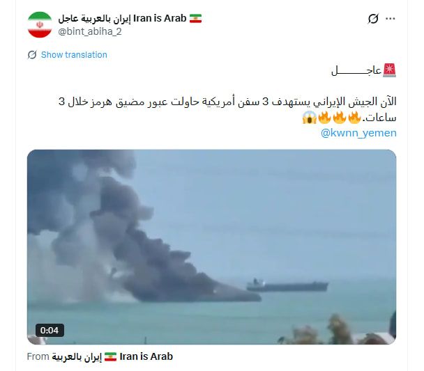ورافق المقطع تعليق يقول: "عاجل: الآن الجيش الإيراني يستهدف 3 سفن أمريكية حاولت عبور مضيق هرمز خلال 3 ساعات".