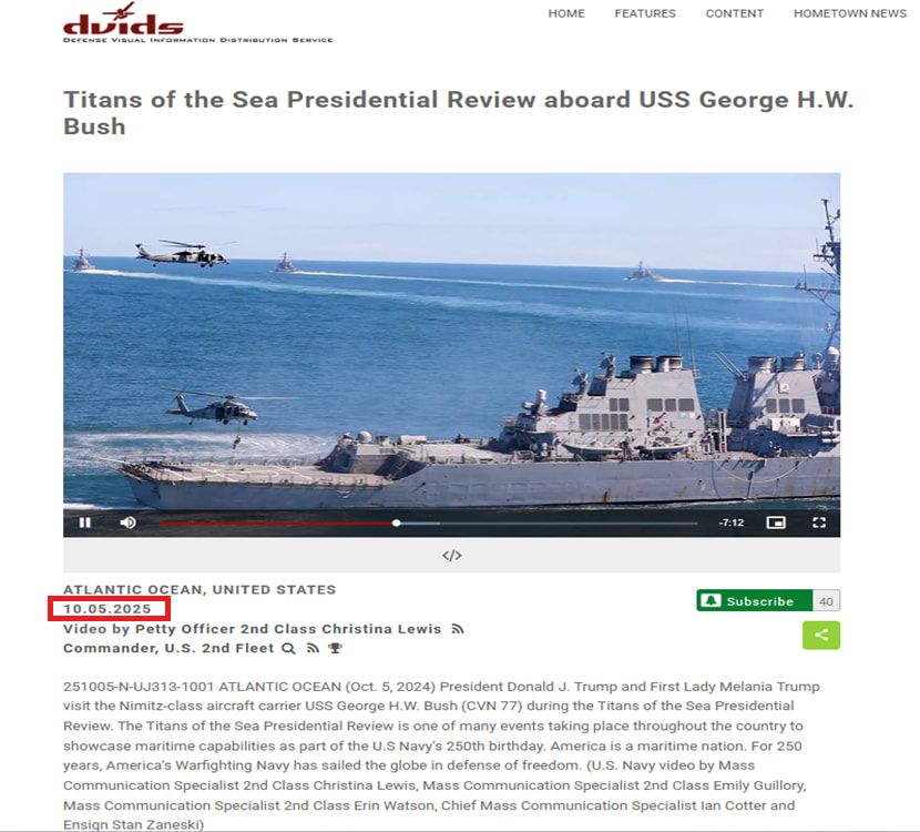 وتتوافر لقطات مشابهة لما وردت في الفيديو المتداول، كانت منشورة في موقع "خدمة توزيع المعلومات المرئية الدفاعية الأمريكية" (DVIDS)، بتاريخ 5 أكتوبر/تشرين الأول 2025.