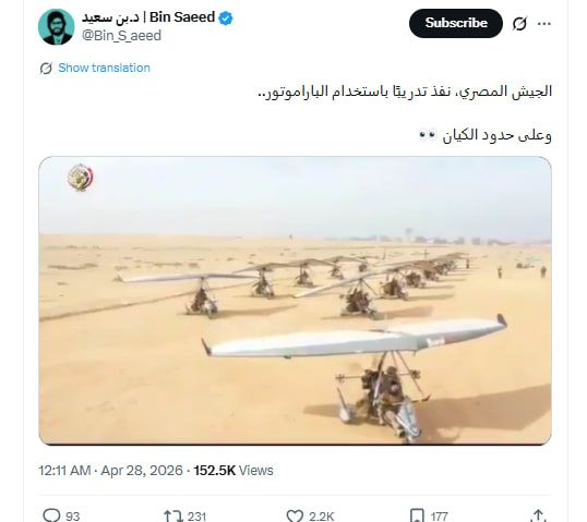 وكتب حساب في موقع إكس تعليقًا مقطع آخر، قائلا: "الجيش المصري، نفذ تدريبًا باستخدام الباراموتور.. وعلى حدود الكيان".