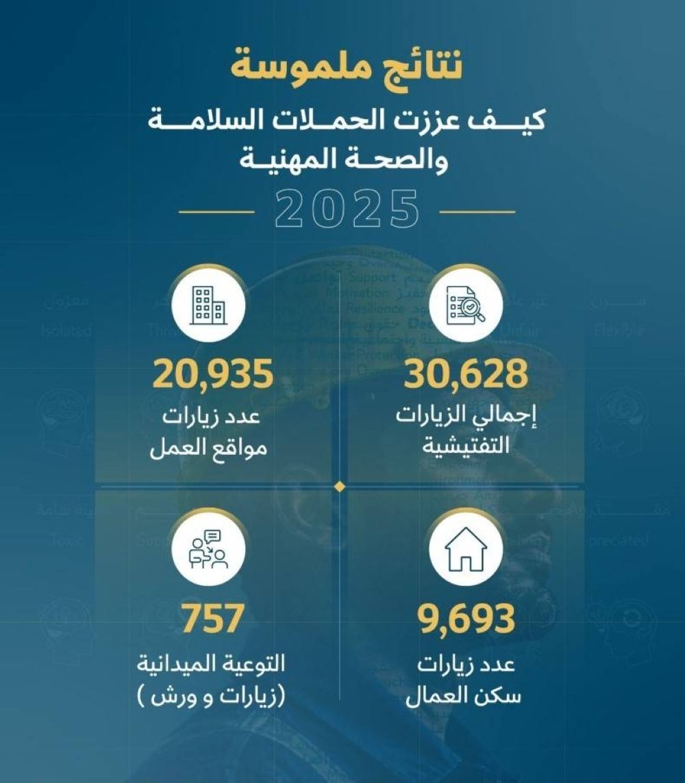 وأظهرت بيانات الوزارة حسب ما أعلنته أمس عبر حسابها بمنصة «إكس» تحقيق نتائج ملموسة خلال عام 2025، حيث بلغ عدد زيارات مواقع العمل 20.935 زيارة، فيما وصل إجمالي الزيارات التفتيشية إلى 30.628 زيارة، في مؤشر يعكس تكثيف الجهود الرقابية وتعزيز المتابعة الميدانية لمستوى الالتزام بالاشتراطات المعتمدة. كما نفذت الوزارة 757 نشاطًا ضمن برامج التوعية الميدانية، شملت زيارات وورش عمل استهدفت رفع مستوى الوعي لدى العمال وأصحاب العمل بأهمية الالتزام بإجراءات السلامة، إلى جانب تسجيل 9.693 زيارة لسكن العمال، ضمن جهود تحسين بيئة الإقامة وضمان توافر اشتراطات الصحة والسلامة فيها.